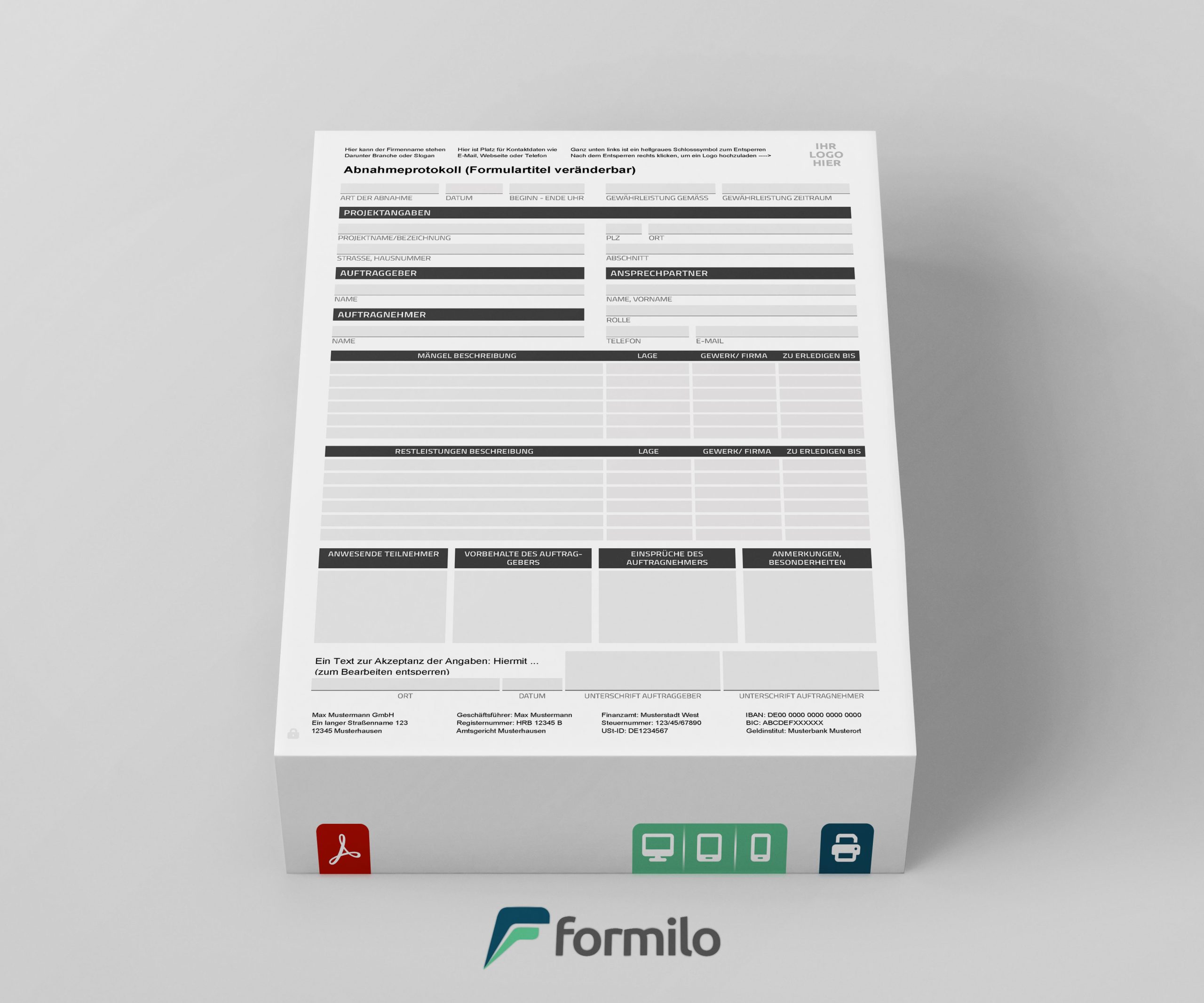 Mit dieser Vorlage wird der gesamte Prozess der Abnahme effizient dokumentiert. Sie eignet sich für alle Branchen, in denen Bauleistungen, Installationen, technische Systeme oder Dienstleistungsverträge formell übergeben und bestätigt werden müssen.