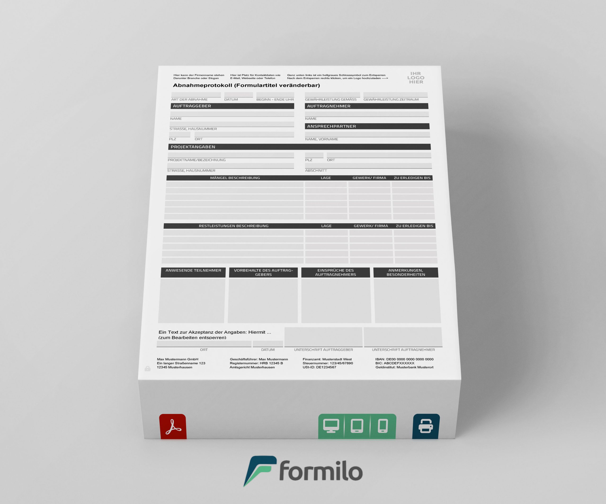 Diese professionelle Abnahmeprotokoll-Vorlage aus dem Formilo-Shop bietet eine praxiserprobte Grundlage zur Dokumentation von Abnahmen in Bauprojekten, Sanierungsmaßnahmen, technischen Dienstleistungen oder bei der Übergabe von Gewerken. Die Vorlage enthält die vollständige Adresse des Auftraggebers – ein Detail, das bei der Nachverfolgung, Archivierung oder Kommunikation mit Dritten von hoher Relevanz ist.