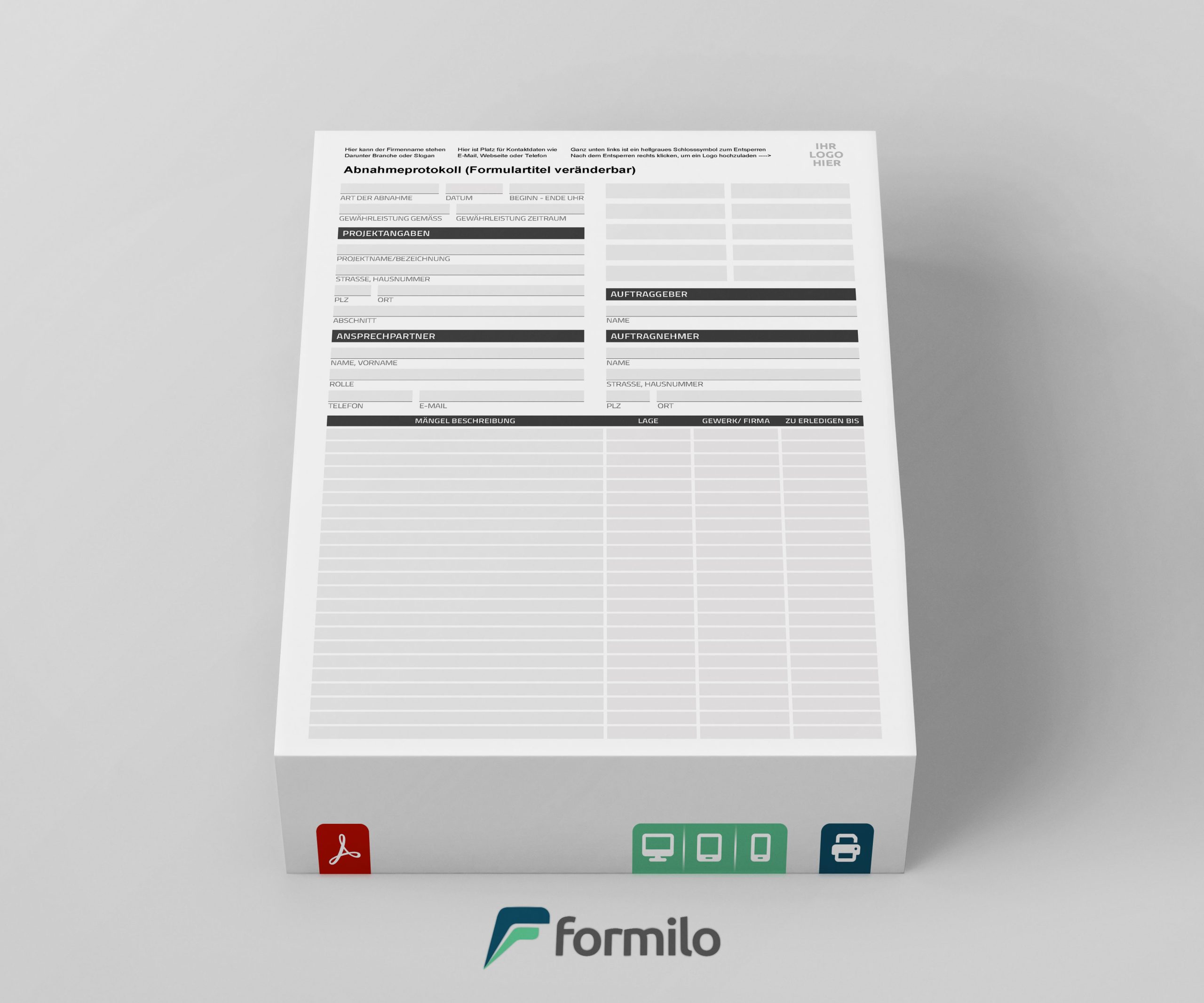 Die Abnahmeprotokoll-Vorlage ist sofort nach dem Kauf im Formilo Webshop verfügbar. Sie ist speziell für den Einsatz mit kostenlosen PDF-Readern wie Adobe Reader konzipiert und lässt sich ohne spezielle Software oder IT-Kenntnisse anpassen. Die Individualisierung erfolgt direkt im Dokument und spart damit Zeit und externe Dienstleisterkosten.