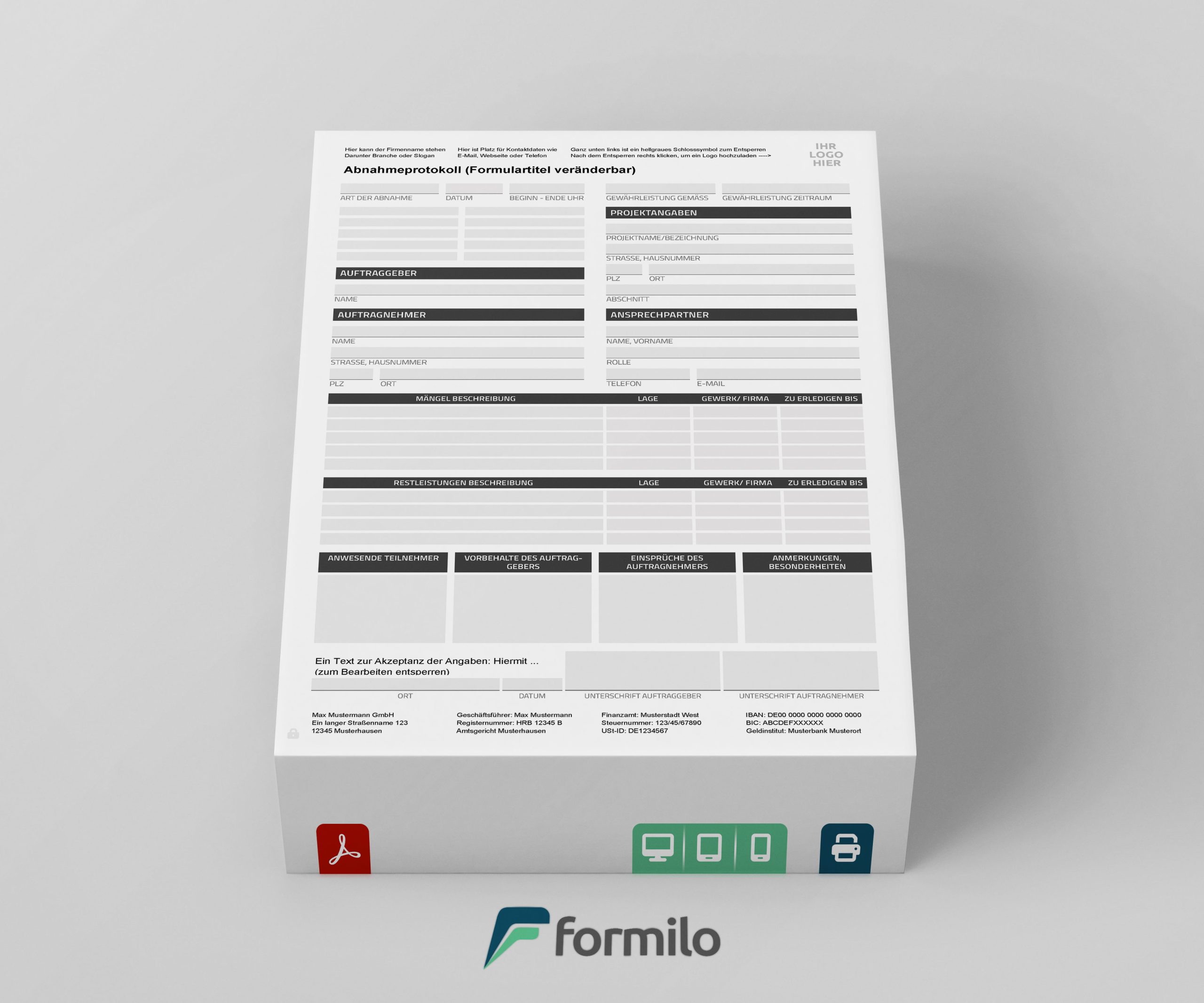 Die Abnahmeprotokoll-Vorlage ist so gestaltet, dass sie ohne jegliche Programmierkenntnisse sofort individualisiert werden kann. Alle relevanten statischen Elemente – wie Kopf- und Fußzeile oder die Formularüberschrift – lassen sich direkt im PDF-Reader wie Adobe Acrobat Reader anpassen. Auch das Hochladen eines Unternehmenslogos erfolgt bequem per Mausklick.