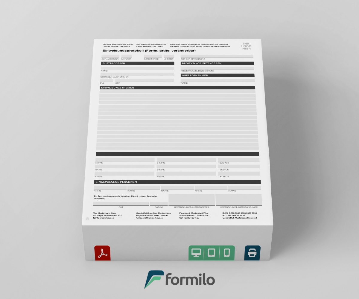 Die Vorlage wird im PDF-Format bereitgestellt und kann direkt nach dem Kauf bei Formilo heruntergeladen werden. Zur Bearbeitung wird kein spezielles Programm benötigt – ein kostenloser PDF Viewer wie Adobe Reader genügt. Durch ein eingebautes Schlosssymbol lassen sich geschützte und editierbare Bereiche voneinander trennen. So bleibt das Dokument für den täglichen Gebrauch zuverlässig strukturiert.