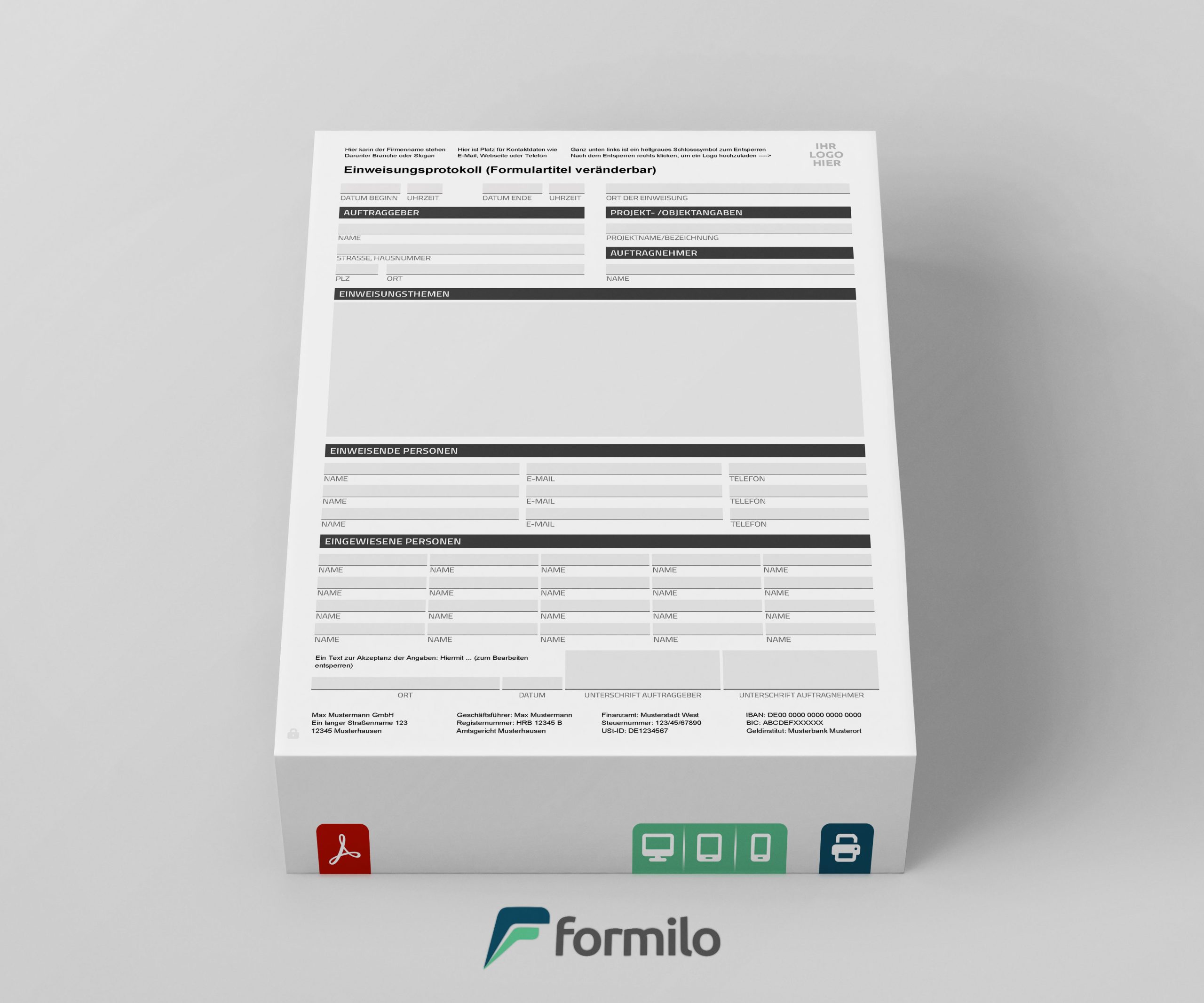 Mit der Einweisungsprotokoll-Vorlage von Formilo sichern Sie die strukturierte Dokumentation Ihrer Einweisungen – inklusive Auftraggeberdetails, einer beschreibenden Themenrubrik, einem dreiköpfigen Einweiserteam und der Möglichkeit, bis zu 20 Teilnehmer zu erfassen. Diese Kombination eignet sich besonders für mittelgroße bis große Einweisungsgruppen, z. B. bei Baustellenstarts, Sicherheitsunterweisungen oder technischen Schulungen.