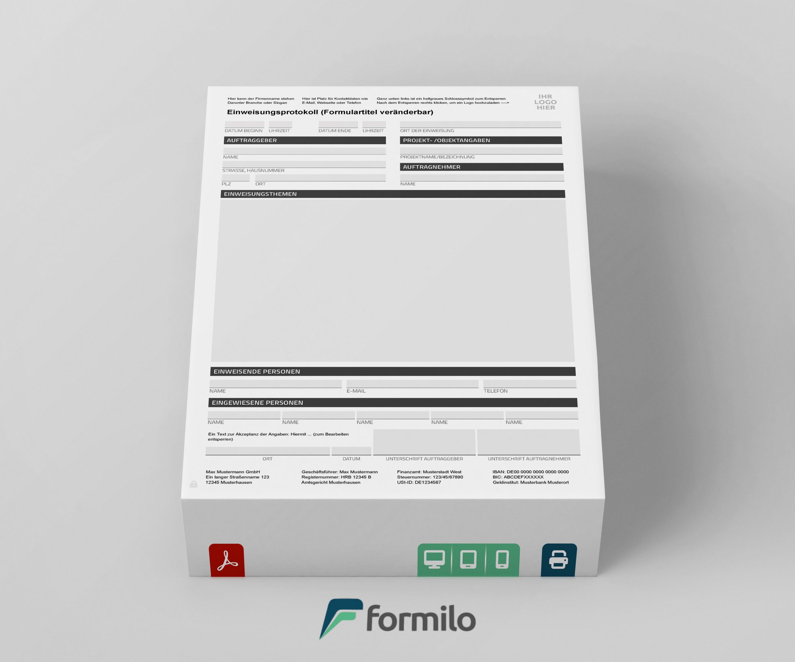Die Vorlage ist sofort nach dem Kauf als editierbares PDF verfügbar. Sie lässt sich mit kostenlosen PDF-Tools wie dem Adobe Reader individuell anpassen – ganz ohne spezielle Software oder Vorkenntnisse. Ob Logo, Kopfzeile oder Formularname: Alle relevanten Informationen können mit wenigen Klicks auf das Corporate Design Ihres Unternehmens abgestimmt werden.