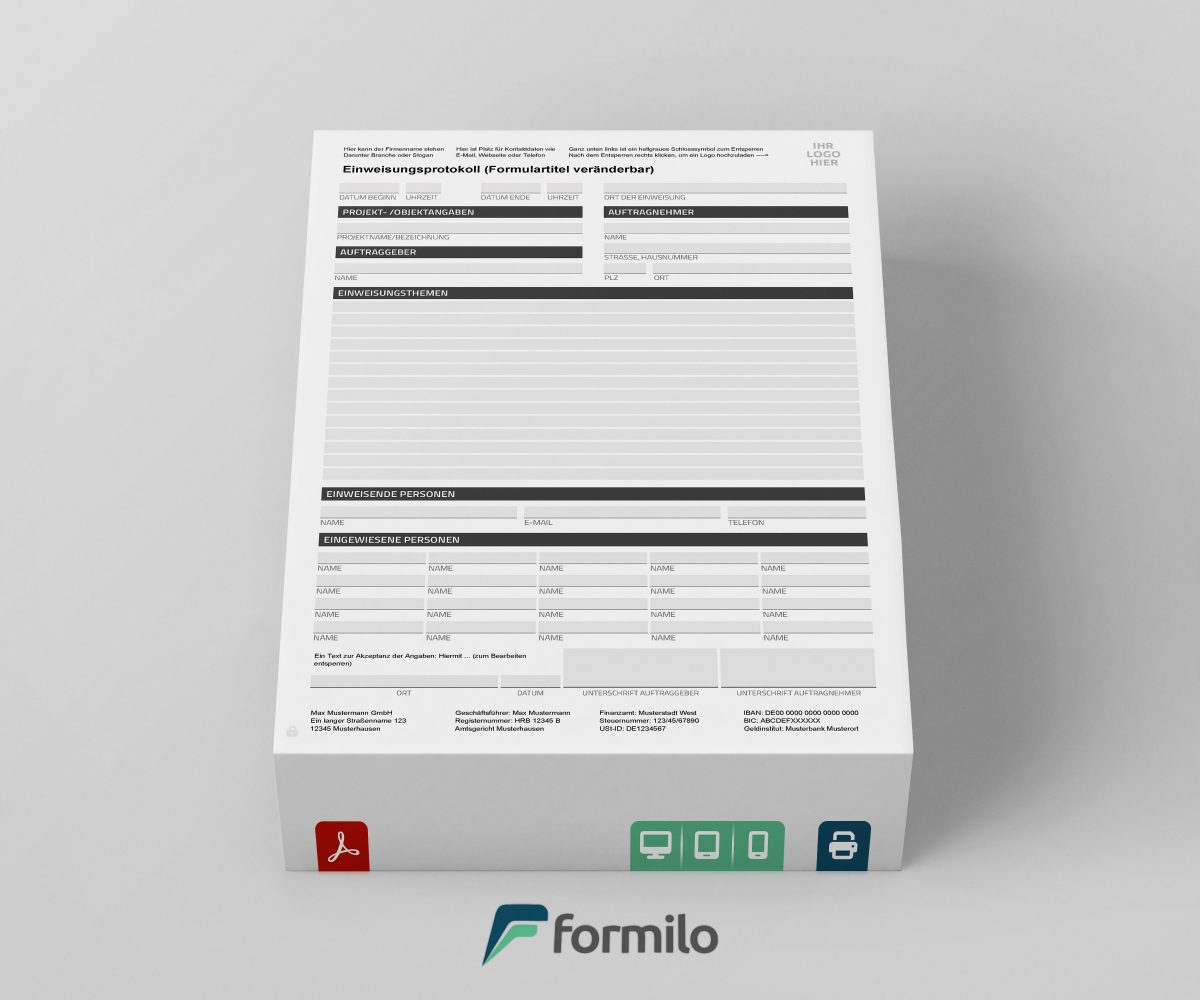 Diese Einweisungsprotokoll-Vorlage eignet sich ideal für alle Unternehmen, die bei projektbezogenen oder sicherheitsrelevanten Schulungen eine präzise Dokumentation benötigen. Die Variante ist so aufgebaut, dass sie Auftragnehmerdetails, eine thematische Auflistung der Einweisungspunkte sowie eine Teilnehmerliste mit bis zu 20 Personen abbildet. Das macht sie besonders geeignet für größere Einweisungsrunden im Baugewerbe, in der Logistik, bei Montagedienstleistern oder im industriellen Umfeld.