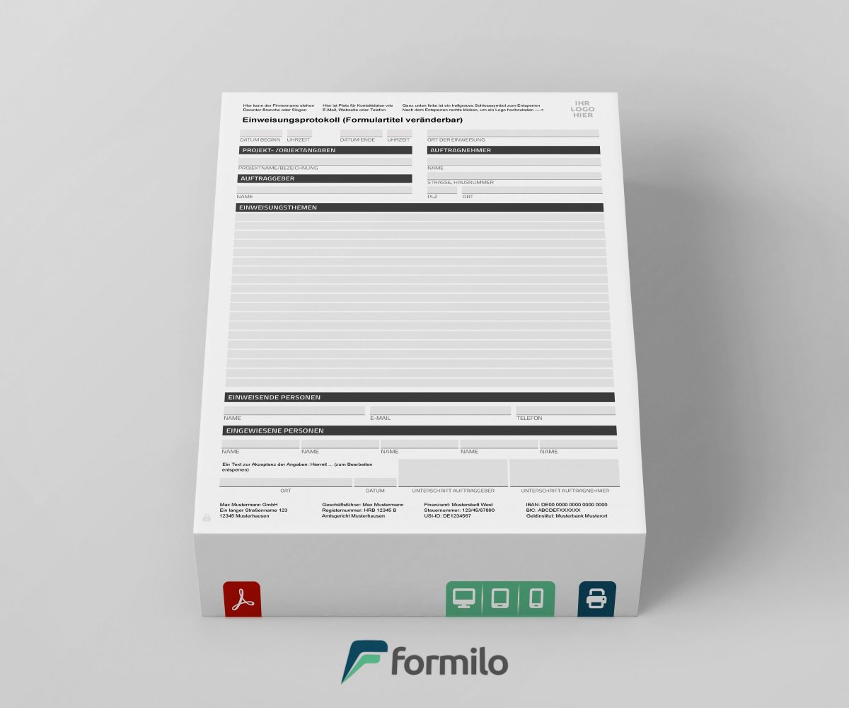 Die Einweisungsprotokoll-Vorlage von Formilo unterstützt Unternehmen dabei, Einweisungen effizient, nachvollziehbar und rechtssicher zu dokumentieren. Die hier vorgestellte Variante enthält eine präzise Themenauflistung und alle relevanten Felder zur Erfassung der Auftragnehmerdaten. Damit eignet sich die Vorlage insbesondere für Einsätze, bei denen externe Dienstleister oder Subunternehmer eingebunden werden – etwa auf Baustellen, in Industrieanlagen oder bei der Inbetriebnahme technischer Anlagen.