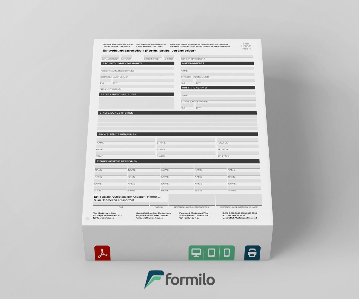 Das Formular eignet sich besonders für sicherheitsrelevante Unterweisungen oder formelle Einweisungen bei Projektstarts. Die strukturierte Darstellung sorgt für Klarheit, Nachvollziehbarkeit und eine hohe Akzeptanz bei den Teilnehmern. Das Einfügen eines eigenen Logos sowie die Anpassung der Kopf- und Fußzeile erhöhen die Professionalität und passen das Dokument visuell an das Corporate Design des Unternehmens an.