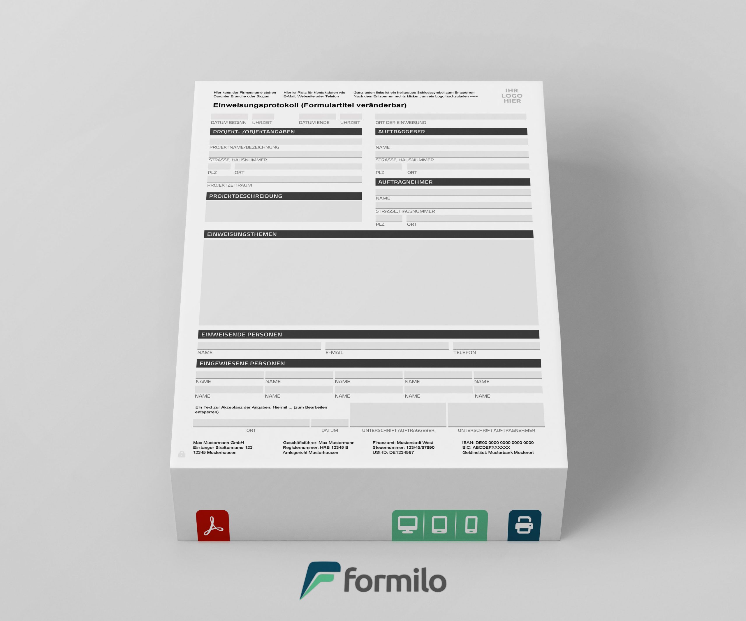 Die Datei kann unmittelbar nach dem Kauf über den Webshop von Formilo heruntergeladen werden. Die Bearbeitung erfolgt bequem im PDF-Format über Programme wie Adobe Reader. Der Nutzer kann Kopf- und Fußzeile sowie die Formularbezeichnung individuell anpassen. Ein eigenes Logo kann per Klick importiert werden. Alle festgelegten Layoutbereiche lassen sich nach der Einrichtung per Schlosssymbol sperren, um eine versehentliche Veränderung im Tagesgeschäft zu vermeiden.