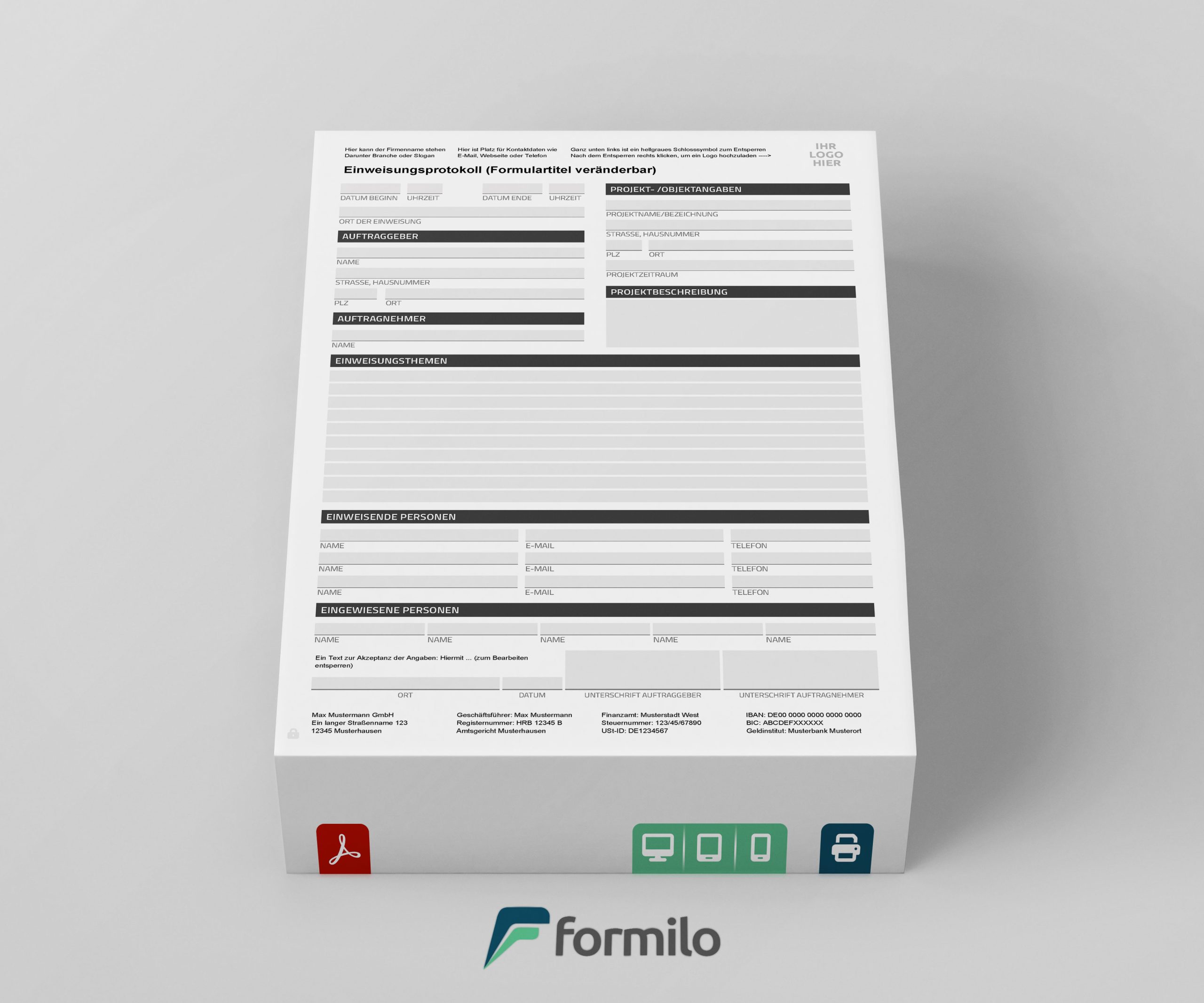 Nach der Erstpersonalisierung kann die Vorlage beliebig oft dupliziert und verwendet werden. Das spart Zeit und sorgt für einheitliche Standards in der Dokumentation. Für Unternehmen mit spezifischen Anforderungen bietet Formilo die Möglichkeit zur Erweiterung – etwa durch zusätzliche Eingabefelder, automatisierte Formate, Dropdown-Menüs oder Sprachvarianten.