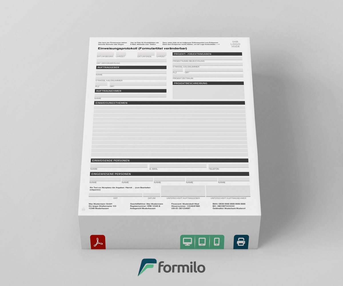 Für Firmen, die regelmäßig ähnliche Einweisungen durchführen, kann die Vorlage nach einer einmaligen Anpassung dauerhaft im Tagesgeschäft verwendet werden. Durch die Möglichkeit der Duplikation und individuellen Weiterentwicklung eignet sie sich hervorragend als Standardformular im Unternehmen. Anpassungen wie die Integration von Firmenvorgaben, neuen Eingabefeldern oder automatisierten Datumsfeldern können über Formilo individuell umgesetzt werden.