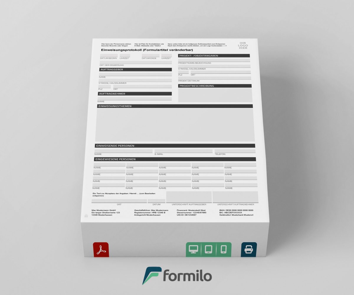 Die Vorlage kann sofort nach dem Kauf bei Formilo heruntergeladen und direkt verwendet werden. Sie ist vollständig interaktiv und erfordert keine zusätzliche Software oder Programmierkenntnisse. Die Bearbeitung erfolgt bequem in einem kostenlosen PDF-Viewer wie Adobe Reader. Anpassungen an Kopfzeile, Fußzeile, Formularname und Logo sind unkompliziert möglich. Ein integriertes Schlosssymbol schützt das Layout vor unbeabsichtigten Änderungen – die Formularfelder bleiben dabei frei nutzbar.