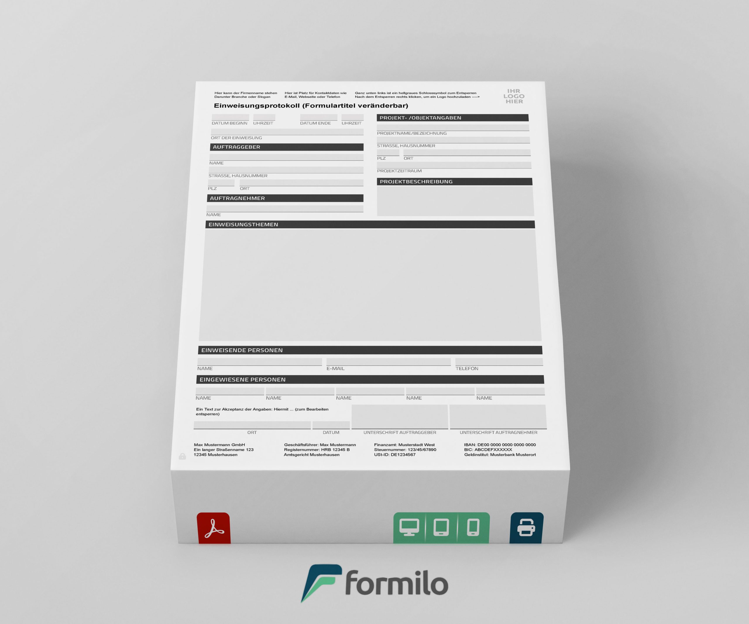Die Vorlage lässt sich mit kostenlosen PDF-Viewern wie Adobe Reader direkt öffnen und bearbeiten. Ein großer Vorteil: Es ist keinerlei zusätzliche Software oder technische Vorkenntnis erforderlich. Alle relevanten Kopfdaten, Fußdaten sowie die Bezeichnung des Dokuments können mit wenigen Klicks angepasst werden.