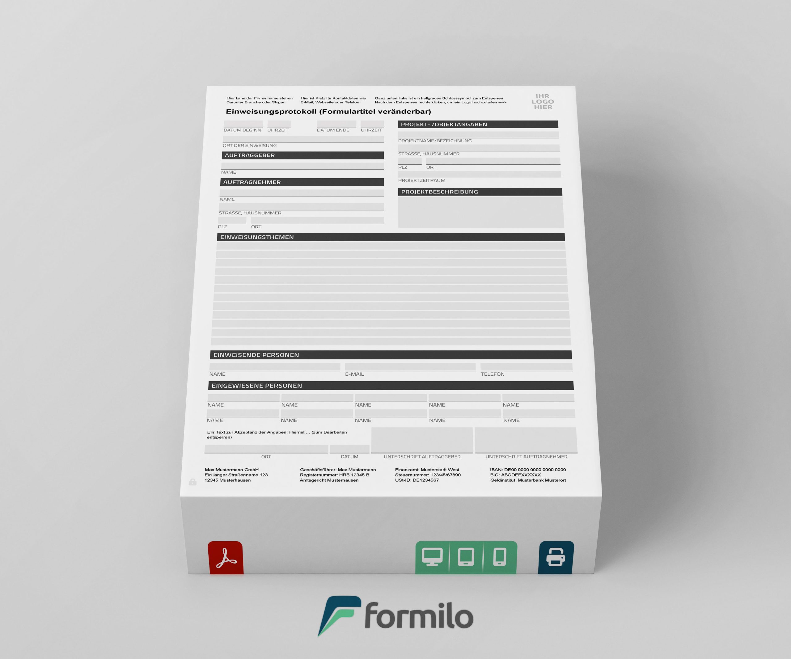 Die gesamte Vorlage lässt sich bequem mit einem kostenlosen PDF Viewer wie Adobe Reader bearbeiten – ganz ohne technische Vorkenntnisse oder spezielle Software. Die Individualisierung erfolgt einfach: Logo, Kopfzeile, Fußzeile und Formularüberschrift können angepasst werden. Nach der Personalisierung wird der Formularrahmen über ein Schlosssymbol fixiert, sodass bei späterer Nutzung nur die vorgesehenen Felder editierbar bleiben.