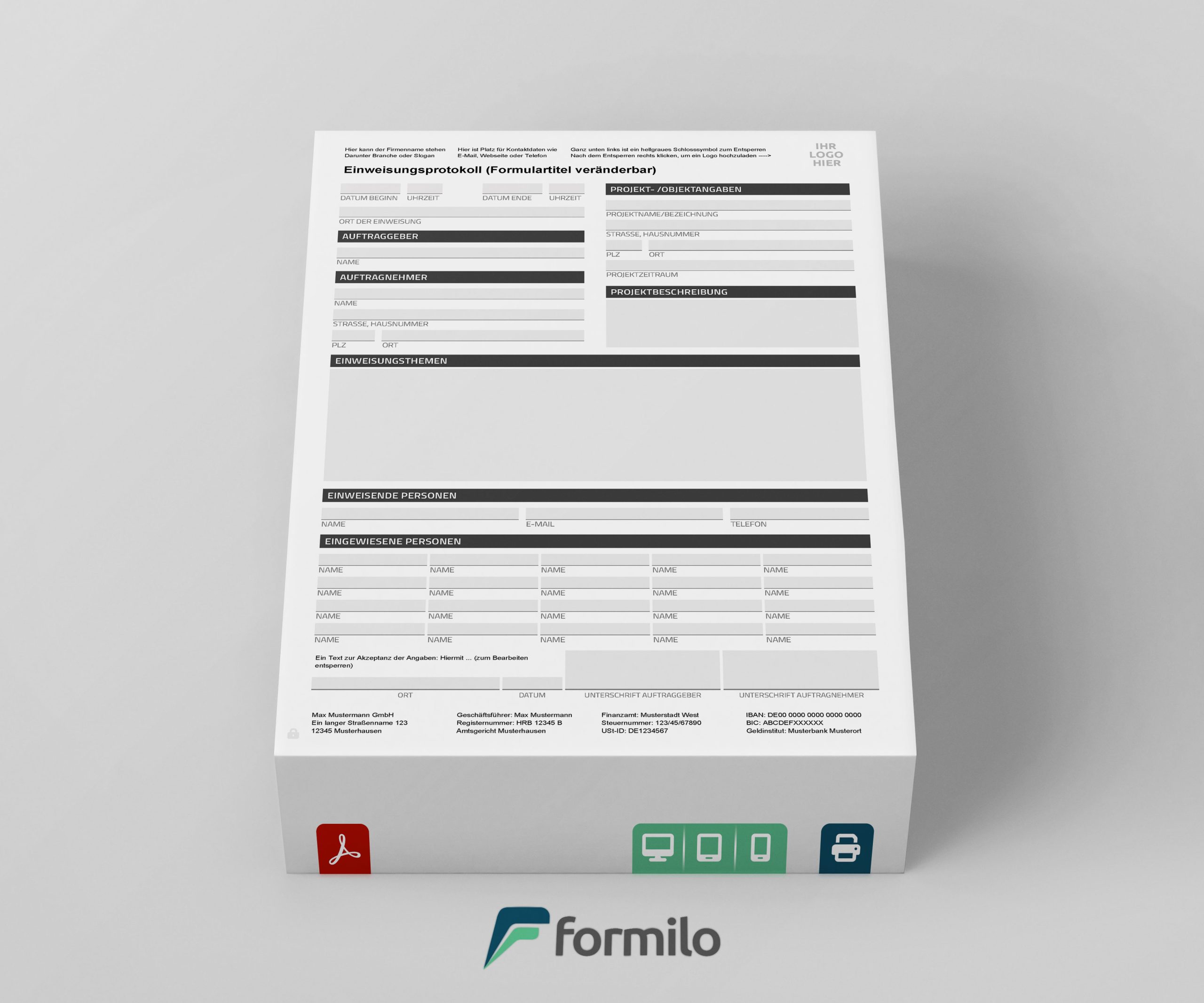 Die Einweisungsprotokoll Vorlage von Formilo bietet Unternehmen eine praxiserprobte Möglichkeit, Einweisungen systematisch zu dokumentieren. Gerade bei Projekten mit sicherheitskritischen, technischen oder organisatorisch relevanten Inhalten ist es notwendig, die vermittelten Themen, Zuständigkeiten und Teilnehmer verbindlich festzuhalten. Diese Vorlage kombiniert Projektdetails, Angaben zum Auftragnehmer, eine mehrzeilige Themenbeschreibung sowie die Möglichkeit zur Teilnehmererfassung von bis zu 20 Personen.