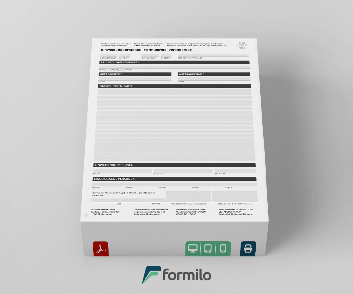 Wie alle Formilo-Vorlagen ist auch diese Einweisungsprotokoll-Datei direkt nach dem Kauf als Download verfügbar und kann mit kostenlosen PDF-Programmen sofort angepasst werden. Ohne technische Hürden lassen sich Firmendaten wie Logo, Adressen oder eigene Kopfzeilen einfach integrieren. Die intuitive Bearbeitung spart nicht nur Zeit, sondern reduziert auch Fehlerquellen.