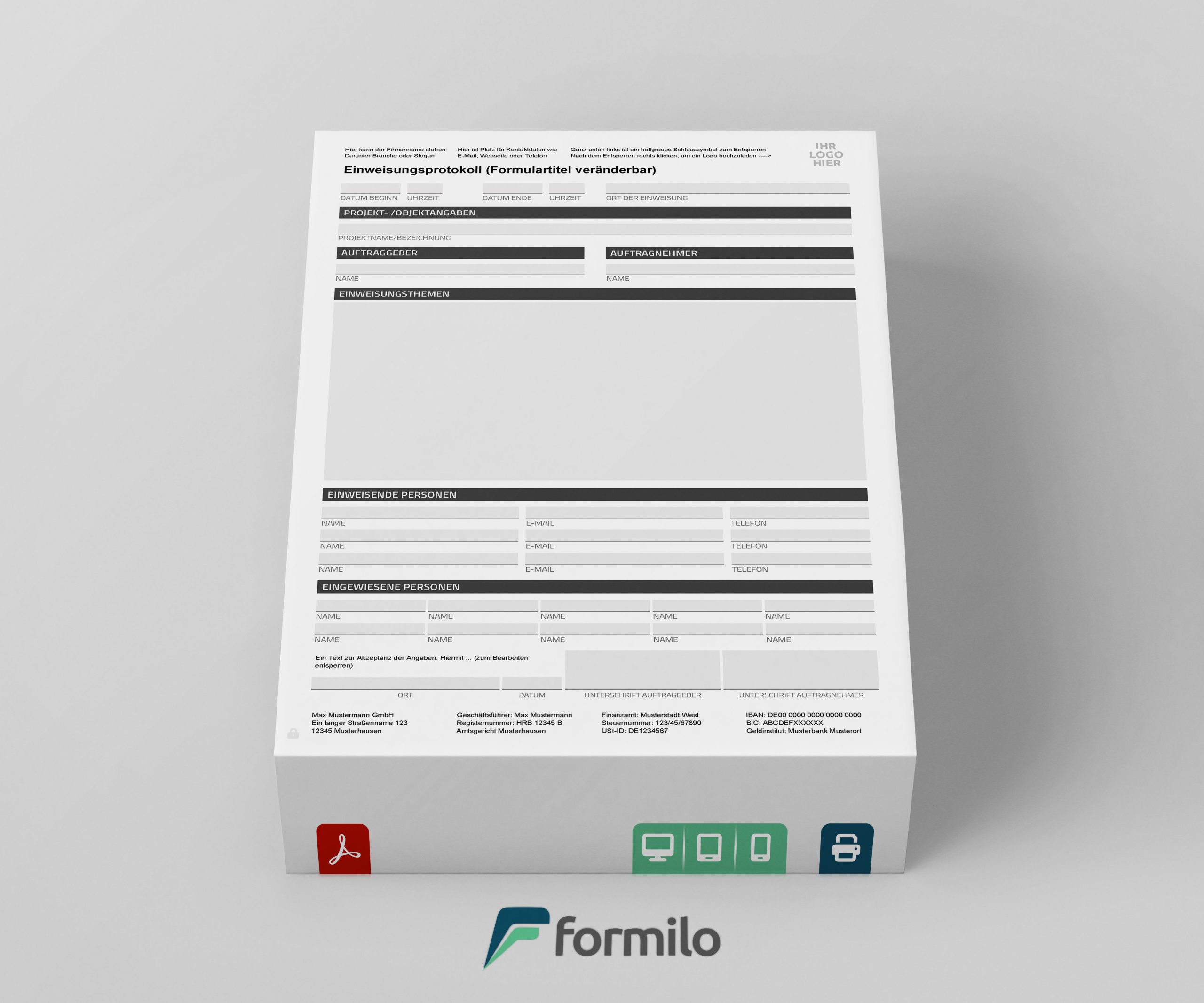 Die Einweisungsprotokoll-Vorlage steht direkt nach dem Kauf bei Formilo zum Download bereit. Sie ist so aufgebaut, dass sie mit einem kostenlosen PDF-Viewer wie Adobe Reader sofort geöffnet und angepasst werden kann – ganz ohne Programmierkenntnisse oder Spezialsoftware. Dies spart Zeit bei der Einführung und macht die Lösung für jede Unternehmensgröße praktikabel.