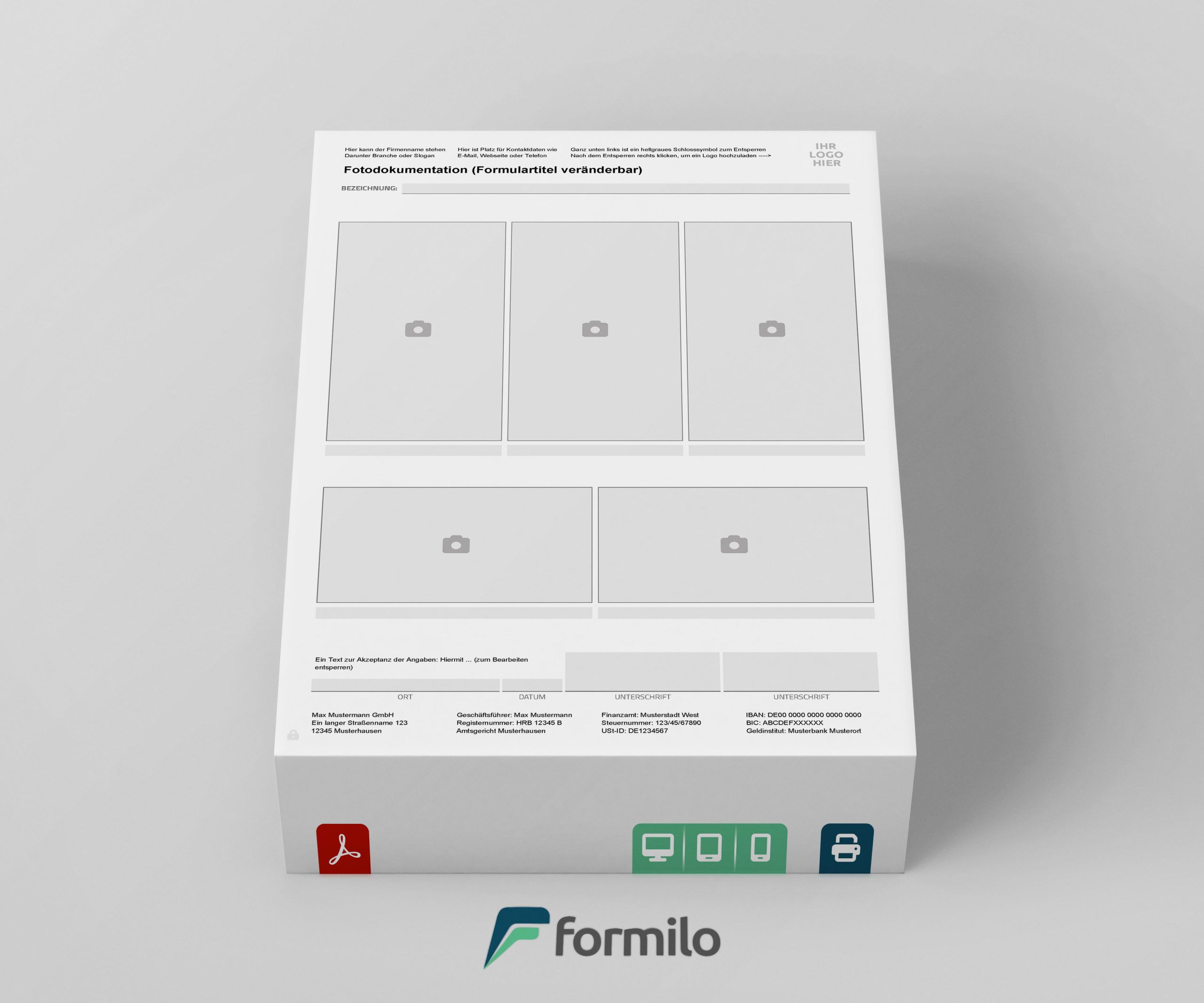Wie alle Vorlagen von Formilo ist auch dieses Formular vollständig editierbar mit kostenloser Standardsoftware wie dem Adobe Reader. Die Personalisierung ist besonders einfach gehalten: Kopfdaten, Formularbezeichnung und Fußzeilen können direkt geändert werden. Auch das Einfügen des eigenen Firmenlogos ist problemlos möglich.