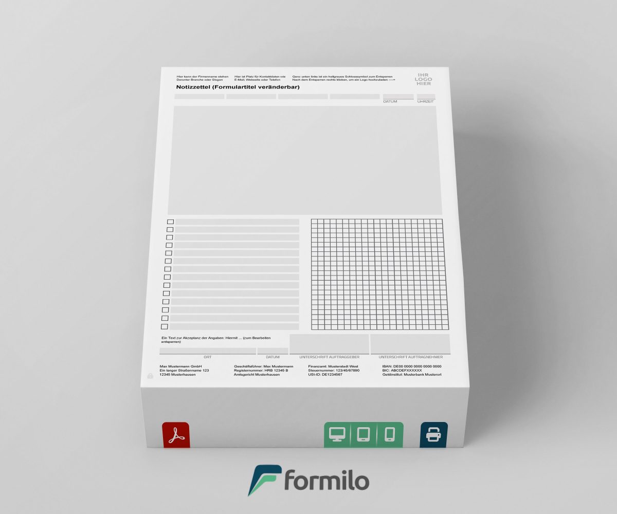 Diese Notizzettel Vorlage von Formilo bietet eine umfassende Lösung für die strukturierte Dokumentation im Arbeitsalltag. Sie steht nach dem Kauf sofort als Download bereit und kann ohne zusätzliche Software genutzt werden. Mit einem kostenlosen PDF Viewer wie Adobe Reader lassen sich Kopfdaten, Fußzeilen und die Formularbezeichnung unkompliziert personalisieren. Auch das Einfügen des Firmenlogos gelingt in wenigen Klicks, sodass jedes Dokument professionell aussieht und zum Corporate Design passt.
