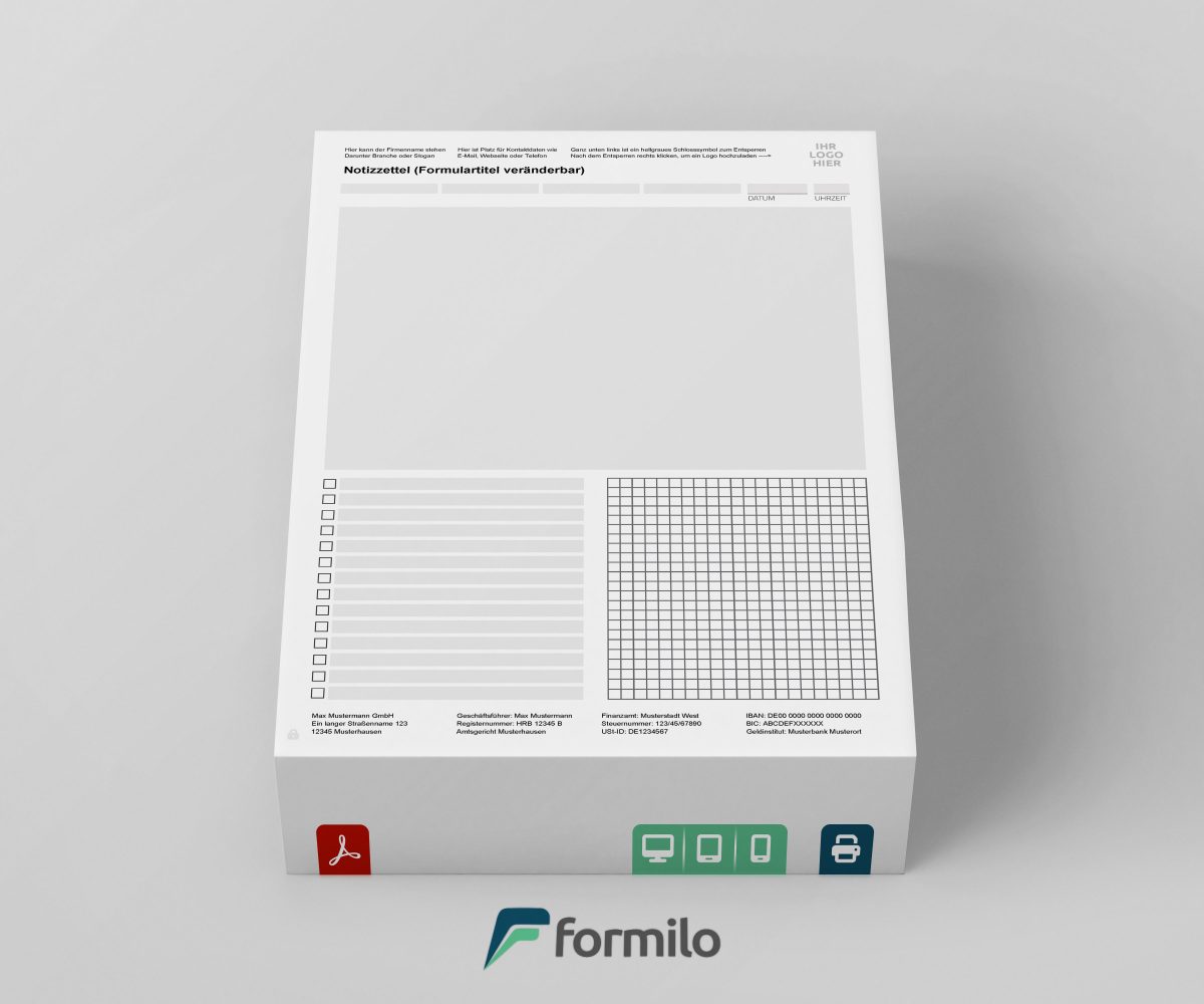 Die Notizzettel Vorlage von Formilo kombiniert eine klare Struktur mit praxisnahen Funktionen und ist sofort nach dem Kauf als Download verfügbar. Sie wurde speziell entwickelt, um die tägliche Dokumentation in Unternehmen zu vereinfachen und gleichzeitig eine professionelle Außenwirkung zu erzielen. Dank der Bearbeitung in einem kostenlosen PDF Viewer wie Adobe Reader lassen sich alle wichtigen Bereiche ohne technische Vorkenntnisse anpassen. Neben den Kopfdaten, Fußzeilen und der Formularbezeichnung kann auch das Firmenlogo integriert werden, wodurch die Vorlage optimal ins Corporate Design passt.