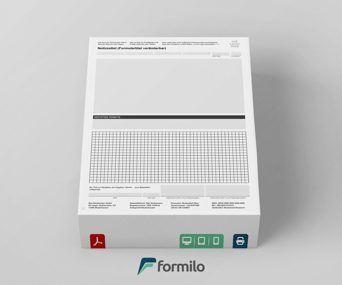 Die Notizzettel Vorlage von Formilo ist ein praxiserprobtes PDF-Formular, das sofort nach dem Kauf heruntergeladen werden kann. Sie bietet Unternehmen eine strukturierte und gleichzeitig flexible Möglichkeit zur Dokumentation. Die Bearbeitung erfolgt über einen kostenlosen PDF-Viewer wie Adobe Reader – zusätzliche Software ist nicht erforderlich. Kopfdaten, Fußzeilen und die Formularbezeichnung lassen sich individuell anpassen, ebenso kann das Firmenlogo mühelos integriert werden. Ein eingebautes Schlosssymbol ermöglicht es, Felder bei Bedarf zu sperren oder wieder freizugeben, sodass die Vorlage optimal für den täglichen Einsatz vorbereitet ist.