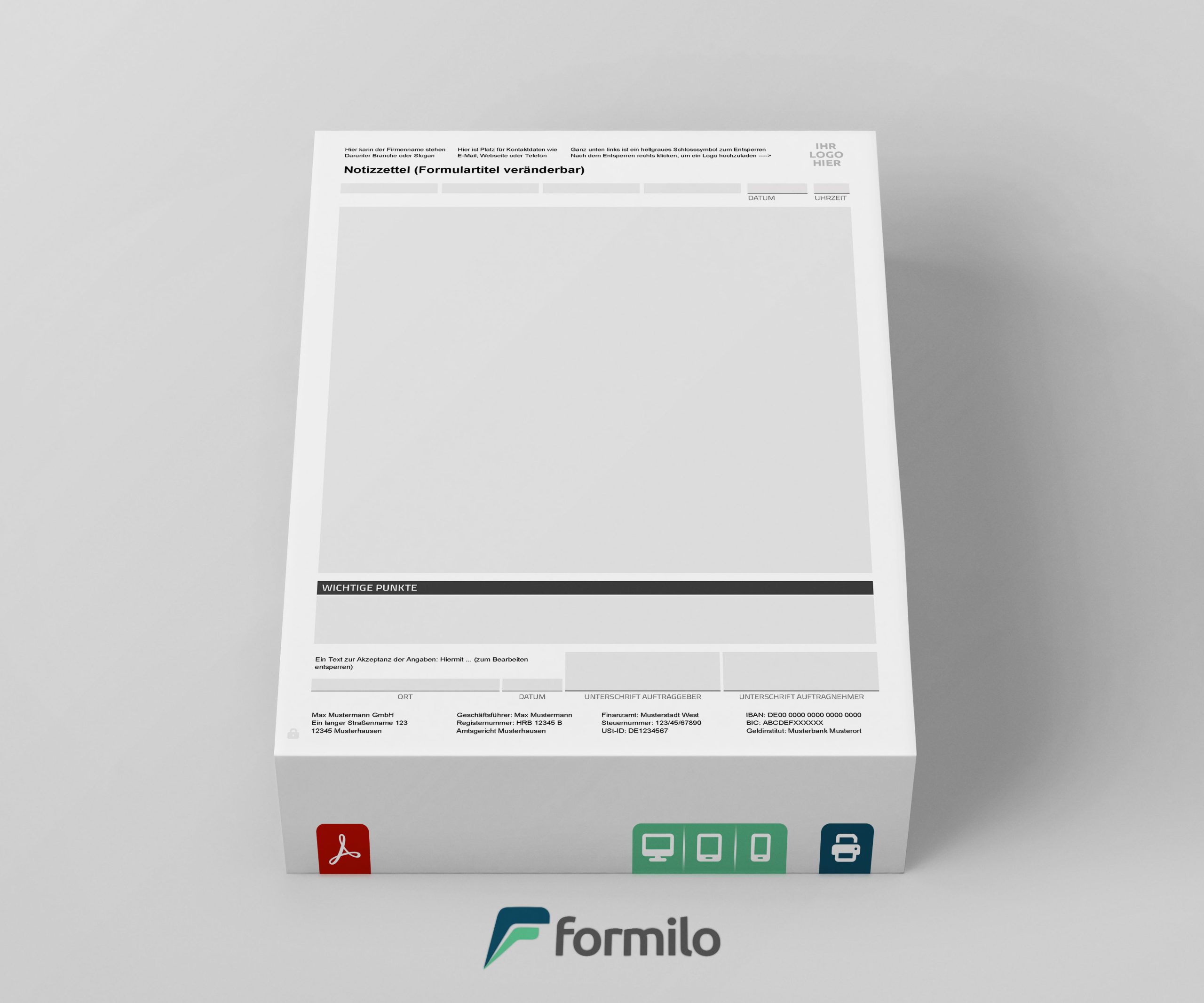 Die Notizzettel Vorlage von Formilo ist eine sofort einsetzbare PDF-Lösung, die direkt nach dem Kauf heruntergeladen werden kann. Sie richtet sich an Unternehmen, die ihre Dokumentation effizient, professionell und flexibel gestalten möchten. Dank der Bearbeitung mit einem kostenlosen PDF-Viewer wie Adobe Reader ist keine zusätzliche Software oder Programmierkenntnis erforderlich. Die Nutzer können Kopfdaten, Fußzeilen sowie die Formularbezeichnung individuell anpassen. Mit wenigen Klicks lässt sich das eigene Logo integrieren, sodass die Vorlage perfekt ins Corporate Design eingebunden werden kann.
