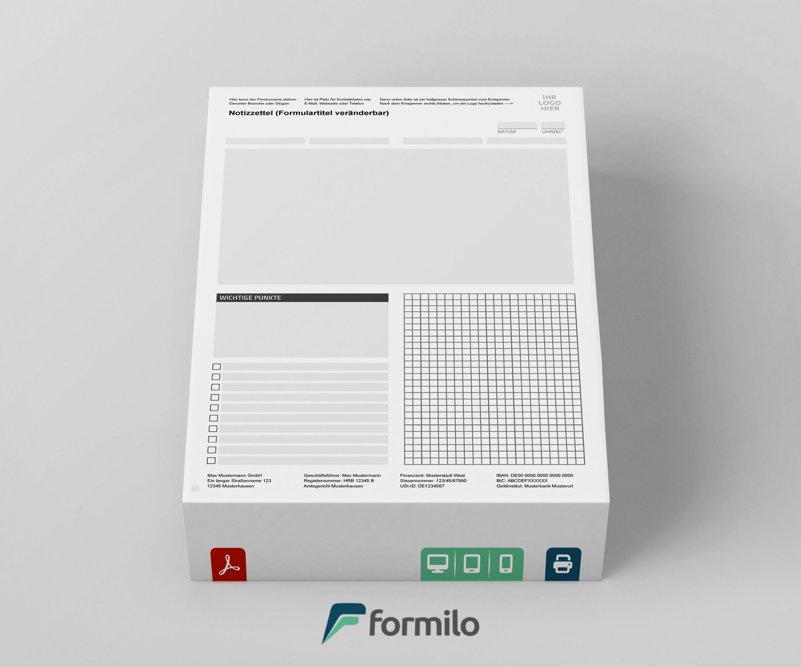 Mit der Notizzettel Vorlage erhalten Unternehmen ein durchdachtes Werkzeug, das die Arbeit erleichtert, Prozesse effizienter macht und gleichzeitig professionell auftritt. Sie ist Teil einer Serie von Formularen, die unterschiedliche Kombinationen von Funktionen anbieten, sodass für nahezu jede Situation die passende Variante gewählt werden kann. Damit stellt Formilo eine moderne Lösung für digitale Dokumentation bereit, die sofort überzeugt.