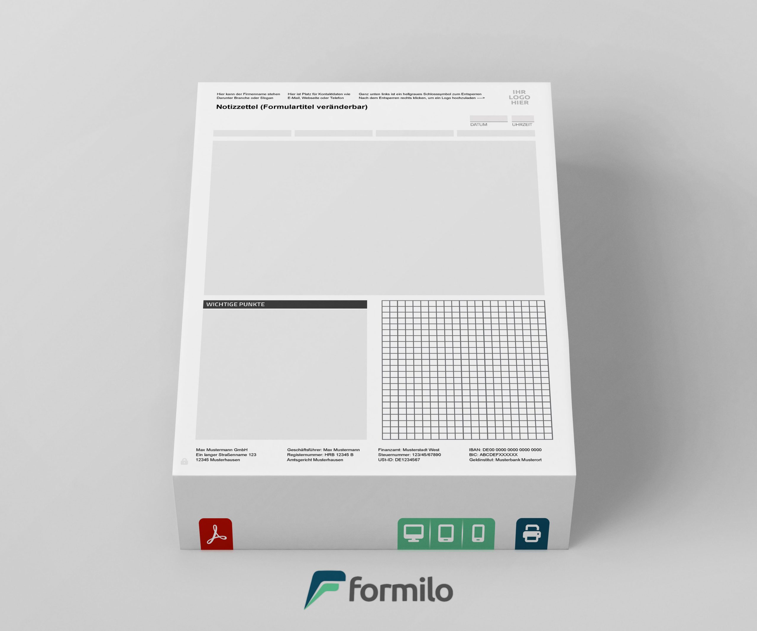 Die Notizzettel Vorlage von Formilo ist ein sofort einsetzbares PDF-Formular, das im Webshop erworben und direkt heruntergeladen werden kann. Sie eignet sich hervorragend für Unternehmen, die strukturierte und nachvollziehbare Dokumentationen benötigen. Der Nutzer kann die Vorlage ohne spezielle Software oder Programmierkenntnisse mit einem kostenlosen PDF-Viewer wie Adobe Reader bearbeiten. Dazu gehören das Anpassen der Kopfdaten und Fußzeilen, die Änderung der Formularbezeichnung sowie das Einfügen des Firmenlogos. Mit wenigen Klicks ist die Vorlage auf das jeweilige Corporate Design abgestimmt.