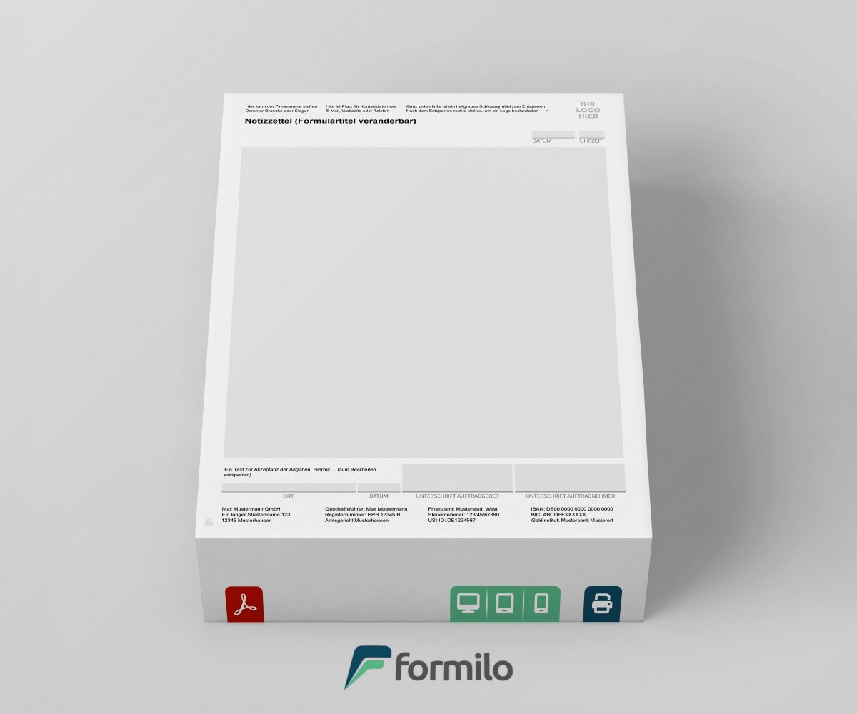 Die Notizzettel Vorlage von Formilo ist ein sofort nutzbares PDF-Formular, das nach dem Kauf direkt im Webshop heruntergeladen werden kann. Sie wurde entwickelt, um Unternehmen eine strukturierte und rechtssichere Möglichkeit zur Dokumentation zu bieten. Die Bearbeitung erfolgt mit einem kostenlosen PDF-Viewer wie Adobe Reader. Kopfdaten, Fußzeilen und die Formularbezeichnung können individuell angepasst werden, zudem lässt sich mit wenigen Klicks das eigene Logo einfügen. Über das eingebaute Schlosssymbol können feste Bereiche gesperrt oder entsperrt werden, sodass im Arbeitsalltag nur die vorgesehenen Felder editierbar sind.