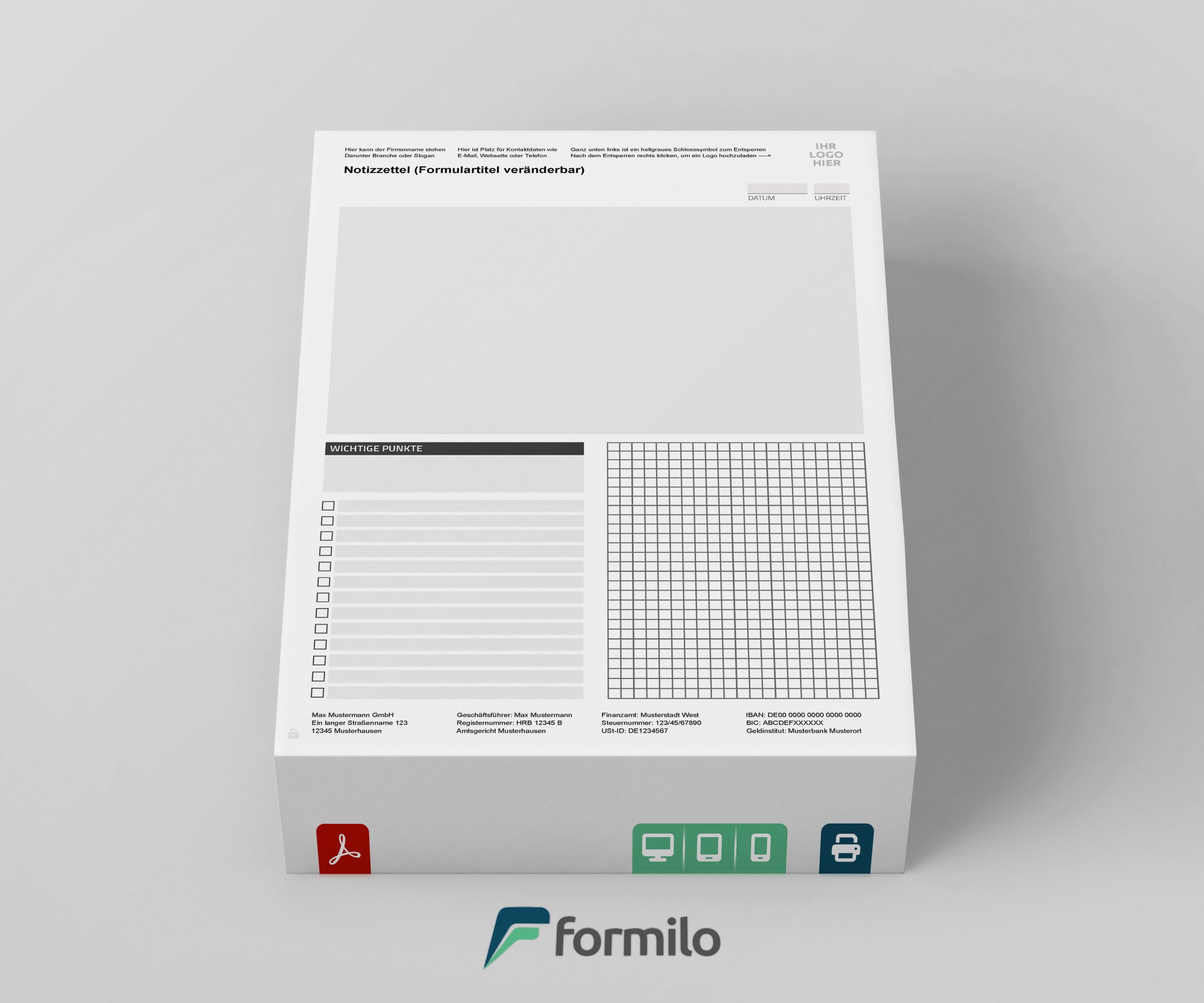 Die Notizzettel Vorlage von Formilo ist ein sofort nutzbares PDF-Formular, das nach dem Kauf direkt im Webshop heruntergeladen werden kann. Sie ist darauf ausgelegt, Unternehmen eine klare und effiziente Möglichkeit zur Dokumentation von Schadensmeldungen, Arbeitsabläufen oder Beobachtungen zu bieten. Nutzer können die Vorlage unkompliziert mit einem kostenlosen PDF-Viewer wie Adobe Reader personalisieren. Dazu gehören das Anpassen der Kopfdaten, Fußzeilen und der Formularbezeichnung sowie das Einfügen des eigenen Logos. Über ein integriertes Schlosssymbol lassen sich feste Bereiche sperren oder entsperren, sodass im Alltag nur die vorgesehenen Felder bearbeitet werden können.