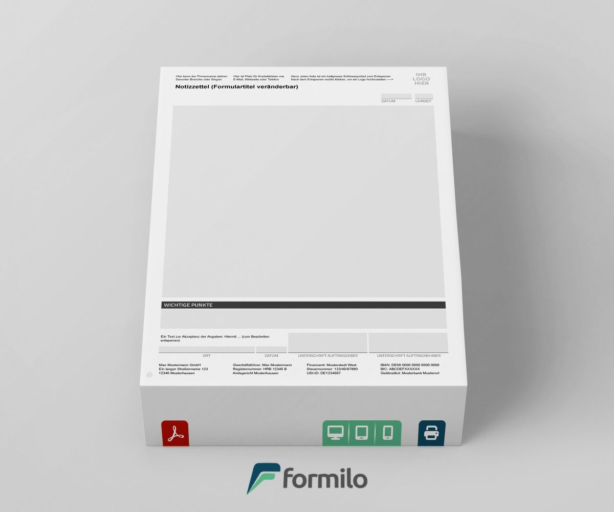 Die Notizzettel Vorlage von Formilo ist ein flexibles PDF-Formular, das nach dem Kauf sofort im Webshop heruntergeladen werden kann. Sie ist für Unternehmen konzipiert, die Informationen nicht nur strukturiert erfassen, sondern auch rechtsverbindlich bestätigen möchten. Mit einem kostenlosen PDF-Viewer wie Adobe Reader lässt sich die Vorlage individuell anpassen. Nutzer können Kopfdaten, Fußzeilen und die Formularbezeichnung ändern sowie das eigene Firmenlogo integrieren. Über das eingebaute Schlosssymbol können Bereiche gesperrt oder entsperrt werden, sodass im Alltag nur die vorgesehenen Felder bearbeitet werden.