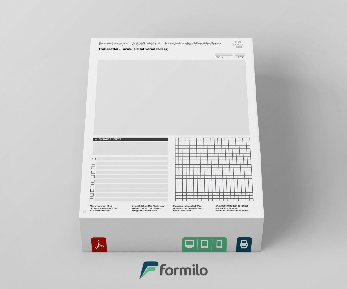 Diese Notizzettel Vorlage von Formilo ist eine durchdachte Lösung für Unternehmen, die Wert auf klare Strukturen und professionelle Dokumentation legen. Sie steht nach dem Kauf im Webshop sofort als Download bereit und kann ohne Zusatzsoftware mit einem kostenlosen PDF Viewer wie Adobe Reader bearbeitet werden. Anpassungen sind ohne Programmierkenntnisse möglich, sodass auch Mitarbeiter ohne IT-Hintergrund die Vorlage effizient nutzen können.