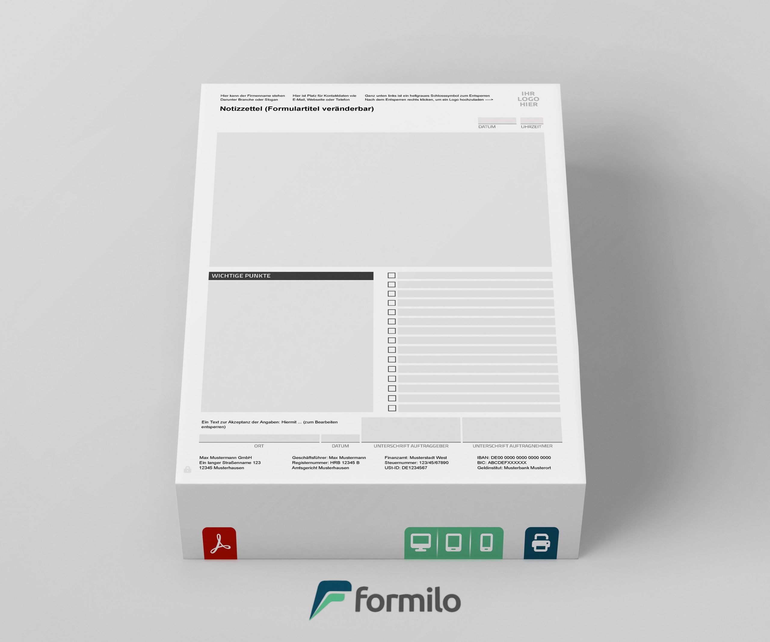 Die Notizzettel Vorlage von Formilo ist ein vielseitiges Formular, das speziell dafür entwickelt wurde, Abläufe im Büro- und Außendienstalltag klar und rechtssicher zu dokumentieren. Sie steht nach dem Kauf sofort als Download zur Verfügung und lässt sich mit gängigen PDF Viewern wie Adobe Reader unkompliziert personalisieren – ganz ohne zusätzliche Software oder Programmierkenntnisse. Nutzer können Kopfdaten, Fußzeilen und die Formularbezeichnung eigenständig anpassen, um die Vorlage optimal an die jeweilige Unternehmensumgebung anzupassen.