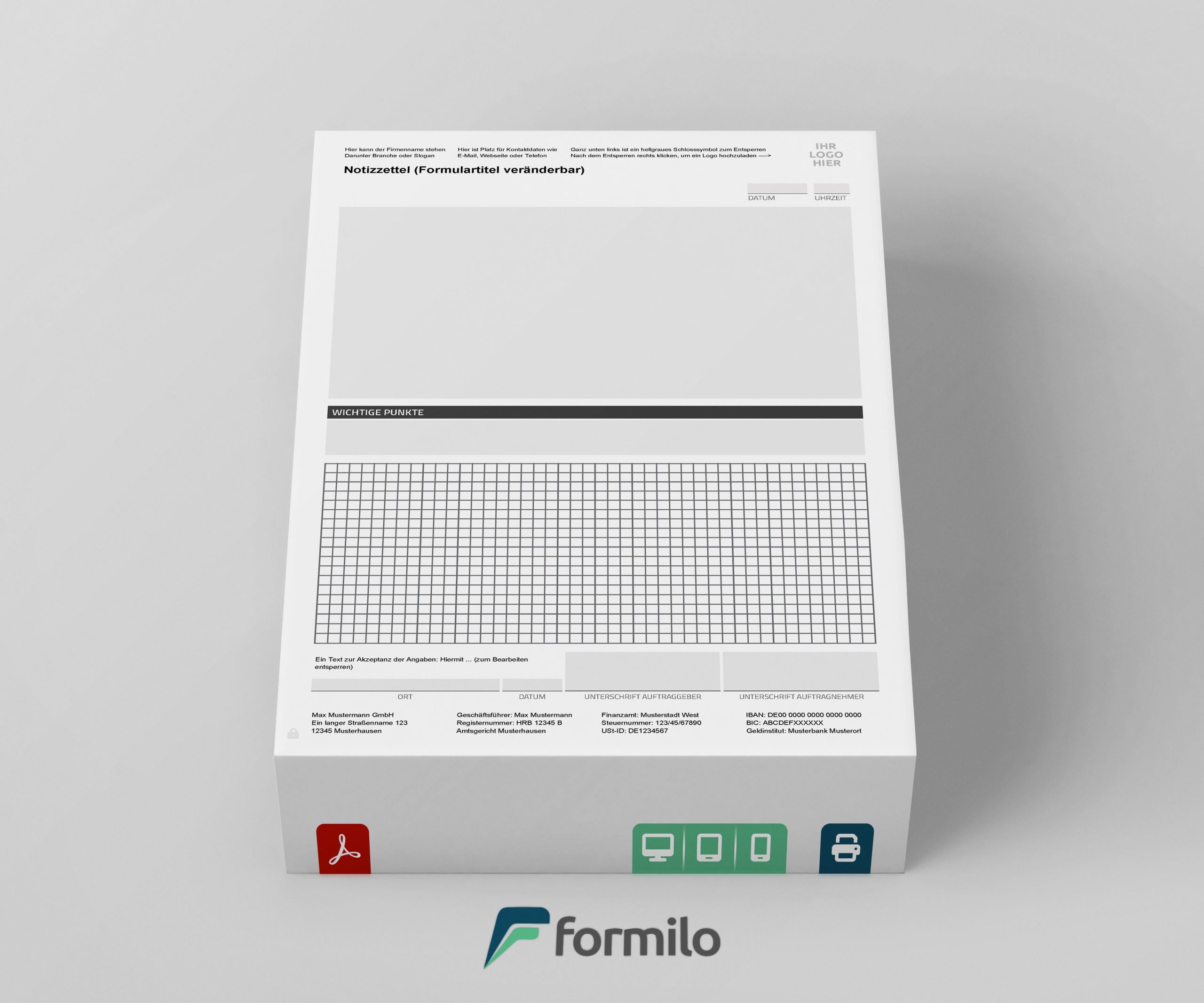 Die Notizzettel Vorlage von Formilo bietet eine praxisgerechte Kombination für Firmen, die Wert auf Übersicht, Genauigkeit und rechtliche Absicherung legen. Sie ist sofort nach dem Kauf als Download verfügbar und lässt sich mit einem kostenlosen PDF Viewer wie Adobe Reader ohne zusätzliche Software anpassen. Der Nutzer kann Kopfdaten, Fußzeilen und die Formularbezeichnung ändern und bei Bedarf mit wenigen Klicks das Firmenlogo einfügen. Dank der integrierten Sperrfunktion bleiben zentrale Felder geschützt und können nur bei Bedarf entsperrt werden. Das sorgt für Sicherheit und erleichtert die tägliche Arbeit.