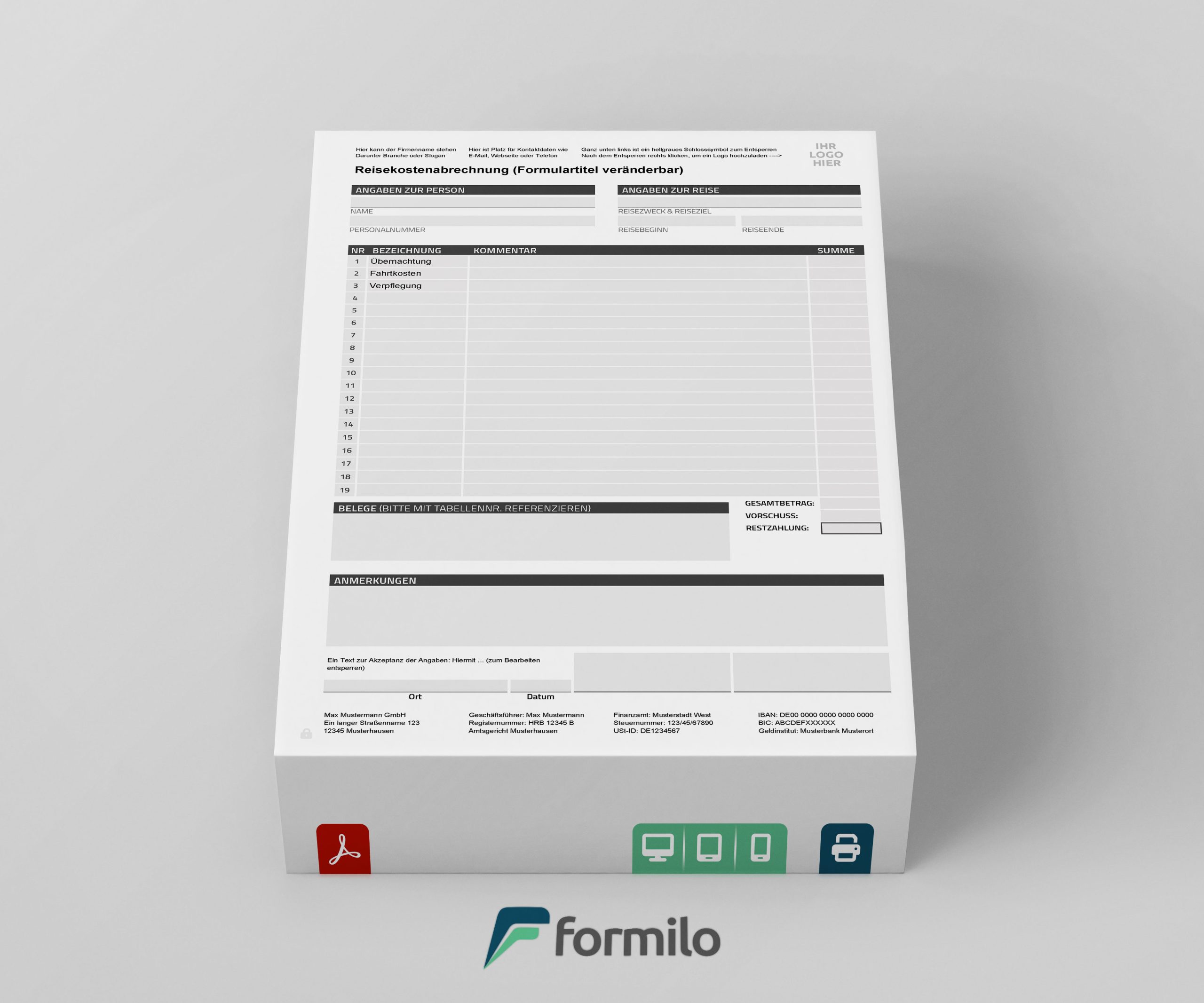 Die PDF-Vorlage kann direkt nach dem Kauf auf dem Webshop von Formilo heruntergeladen und ohne zusätzliche Programme genutzt werden. Die Bearbeitung erfolgt ganz einfach mit einem kostenlosen PDF Viewer wie Adobe Reader. Besonders hervorzuheben ist die intuitive Personalisierungsmöglichkeit: Kopfdaten, Fußzeile und der Formularname können angepasst werden – ebenso lässt sich das eigene Logo per Klick importieren.