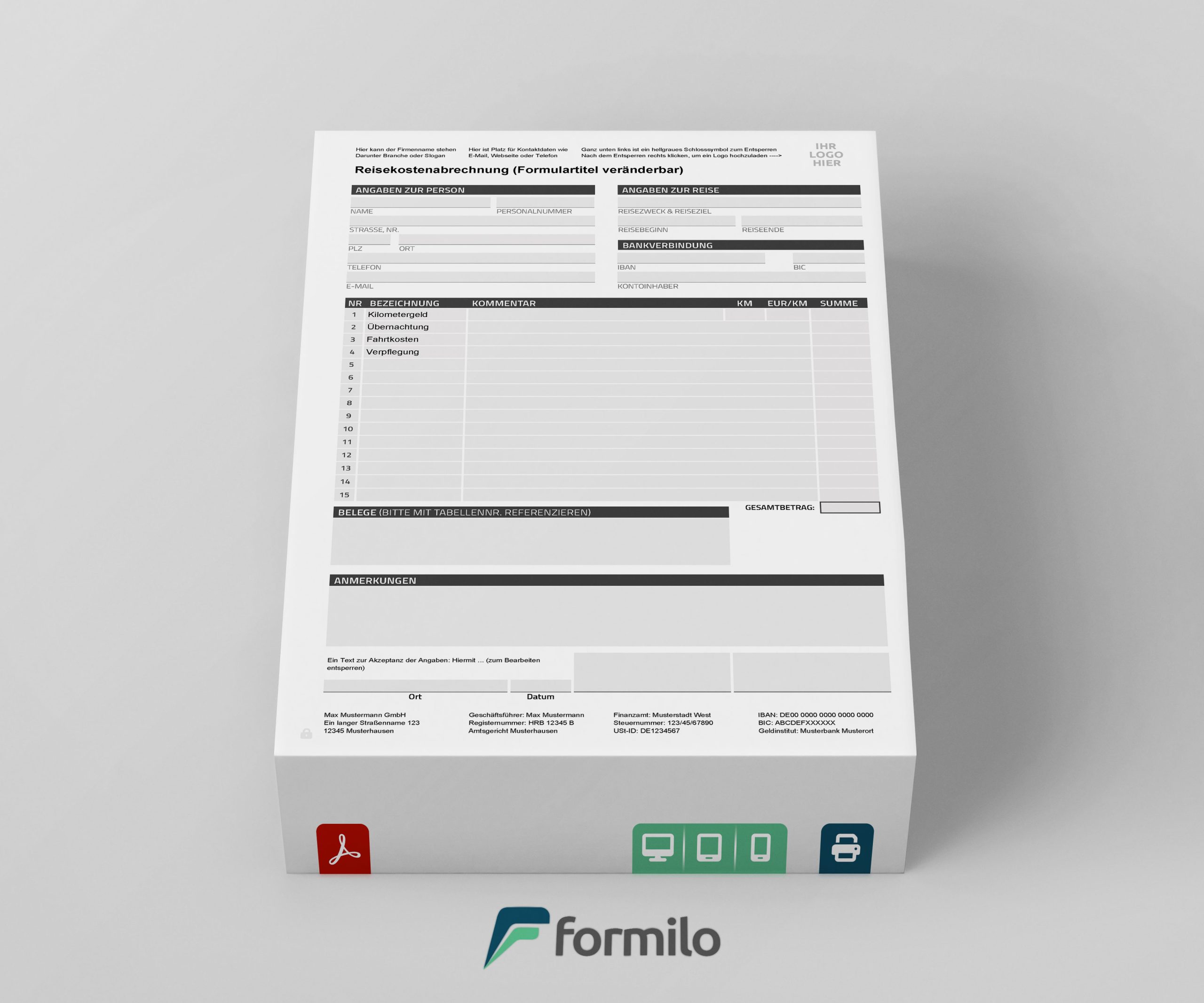 Die Reisekostenabrechnung Vorlage von Formilo ist die perfekte Lösung für Unternehmen, die eine strukturierte und rechtsverbindliche Erfassung von Dienstreisen benötigen. Diese Vorlage ist sofort nach dem Kauf im Webshop von Formilo herunterladbar und lässt sich ohne zusätzliche Softwarekenntnisse nutzen. Mit einem kostenlosen PDF Viewer wie Adobe Reader können Sie sämtliche Kopfdaten, Fußdaten und die Formularbezeichnung bequem anpassen. Ebenso ist es möglich, mit wenigen Klicks das eigene Firmenlogo zu importieren, wodurch sich das Formular optimal in Ihr bestehendes Corporate Design einfügt. Ein integriertes Schlosssymbol ermöglicht das gezielte Entsperren und Sperren von Formularfeldern, sodass bei der täglichen Bearbeitung nur relevante Inhalte geändert werden können. Diese Variante kombiniert die Eingabe von Kontaktdaten, Bankverbindung, Kilometergeld und Vorschuss, wodurch eine präzise und vielseitige Abrechnung mehrerer Reisen sichergestellt wird.