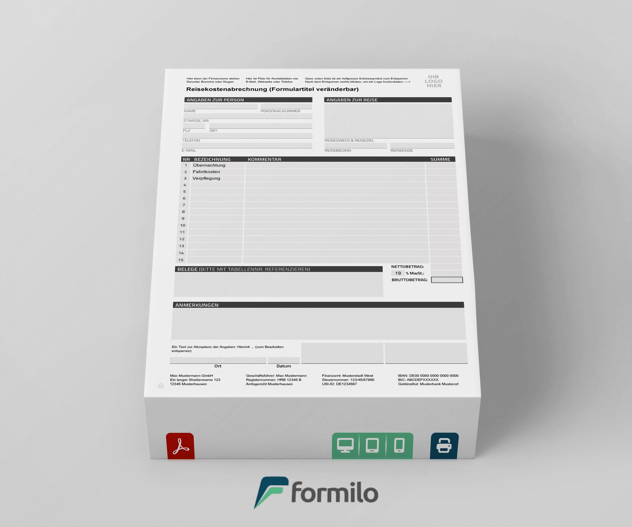 Die klare Trennung von Kontaktinformationen, Reiseinformationen, Steuersätzen und Zahlungsdetails unterstützt Unternehmen bei der effizienten Abrechnung von Auslagen. Dank der digitalen Struktur ist das Formular ideal auch für Archivierung, digitale Übergabe an Steuerberater oder Integration in bestehende Verwaltungsprozesse geeignet.
