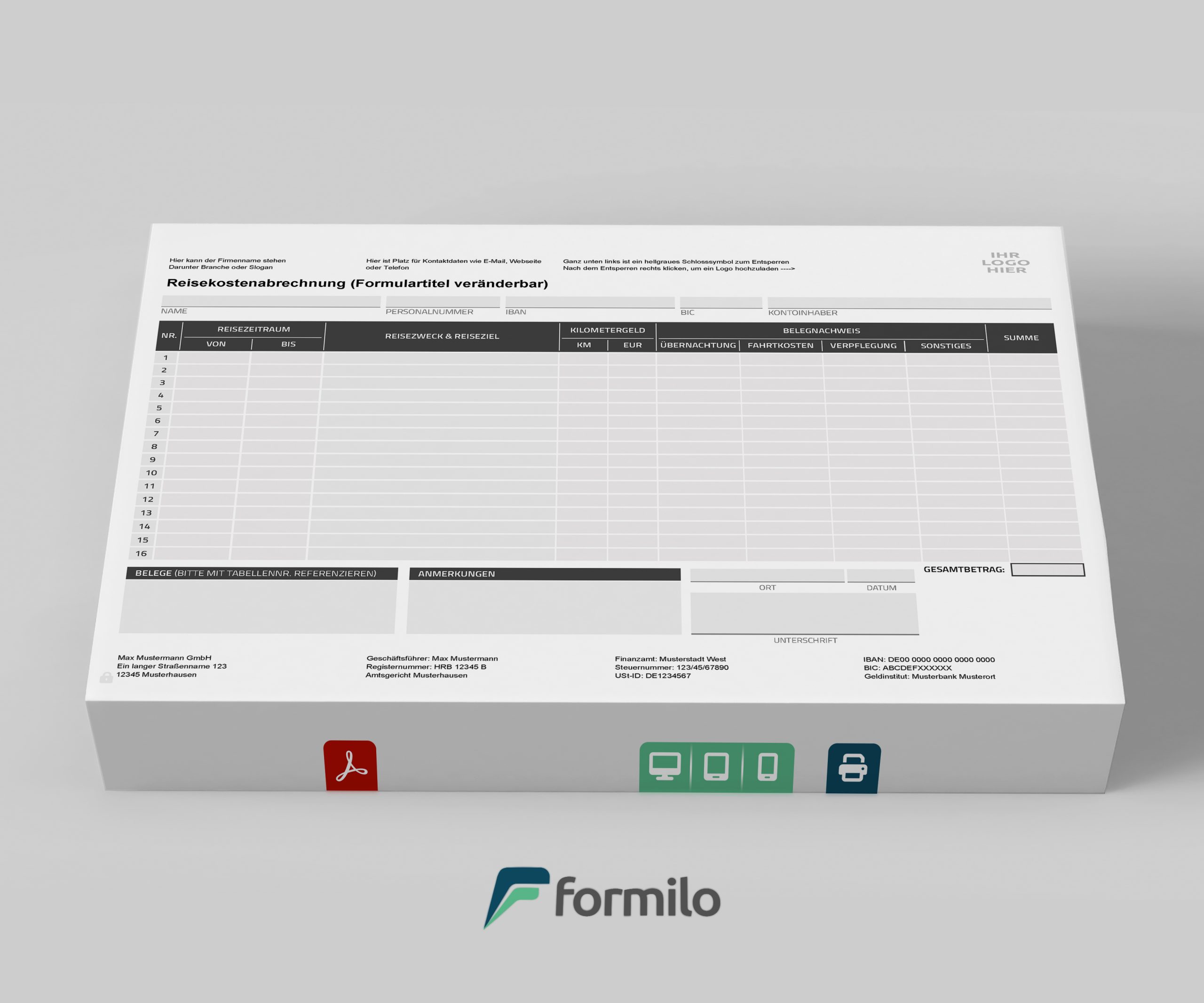 Für eine schnelle und eindeutige Auszahlung können die Bankdaten direkt im Formular eingetragen werden – inklusive IBAN, Kontoinhaber und optionalem Banknamen. In Kombination mit der Belegliste entsteht so eine vollständig prüffähige Reisekostenabrechnung, die internen Kontrollprozessen ebenso gerecht wird wie externen Anforderungen etwa durch Steuerberater oder Prüfstellen.
