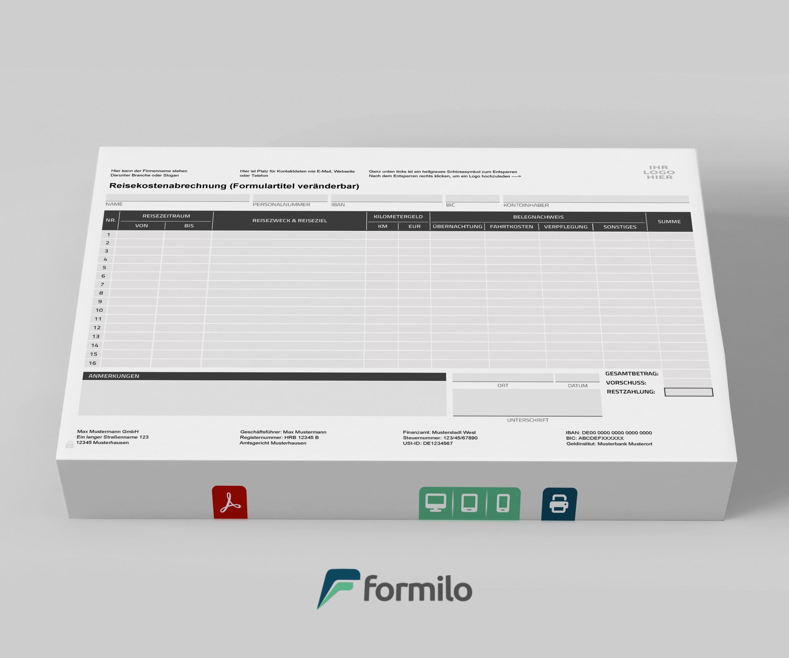 Diese Schutzfunktion ist besonders hilfreich bei unternehmensweitem Einsatz, etwa in der Personalabteilung oder in projektorientierten Teams. Alle relevanten Inhalte bleiben dabei weiterhin frei editierbar – wie z. B. Reisedaten, Kilometeranzahl, Beträge oder Vorschussinformationen. So entstehen einheitlich gestaltete und dennoch individuell nutzbare Formulare.