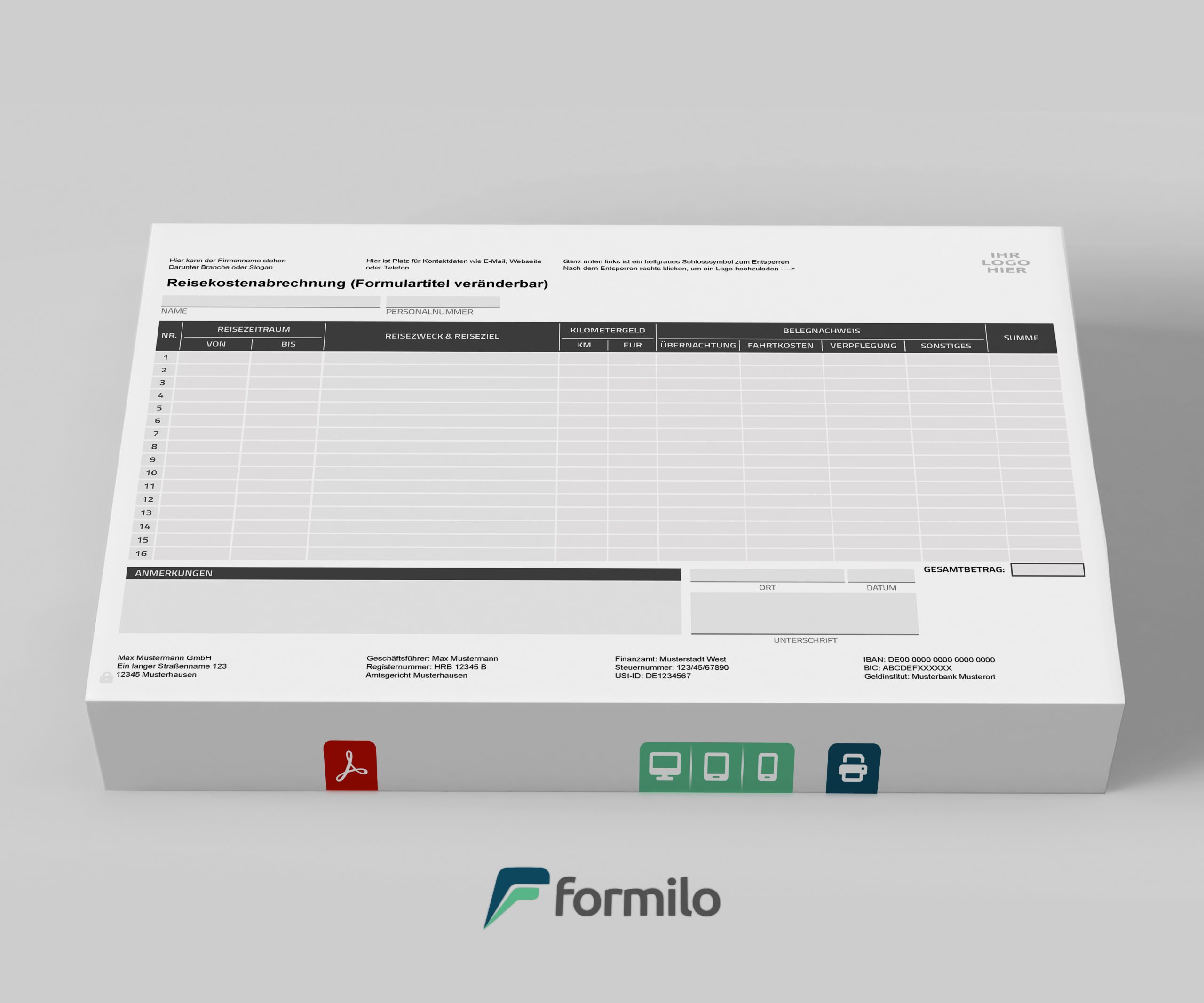 Die Vorlage ist bewusst so gestaltet, dass sie mit kostenlosen PDF-Programmen wie Adobe Reader bearbeitet werden kann. Eine Installation spezieller Software ist nicht erforderlich. Nutzer können mit wenigen Klicks die Formularbezeichnung, Kopf- und Fußbereich sowie das Firmenlogo austauschen. Die Felder für Reisedaten und Kilometer bleiben jederzeit nutzbar, während das Layout durch ein integriertes Schlosssymbol geschützt werden kann.
