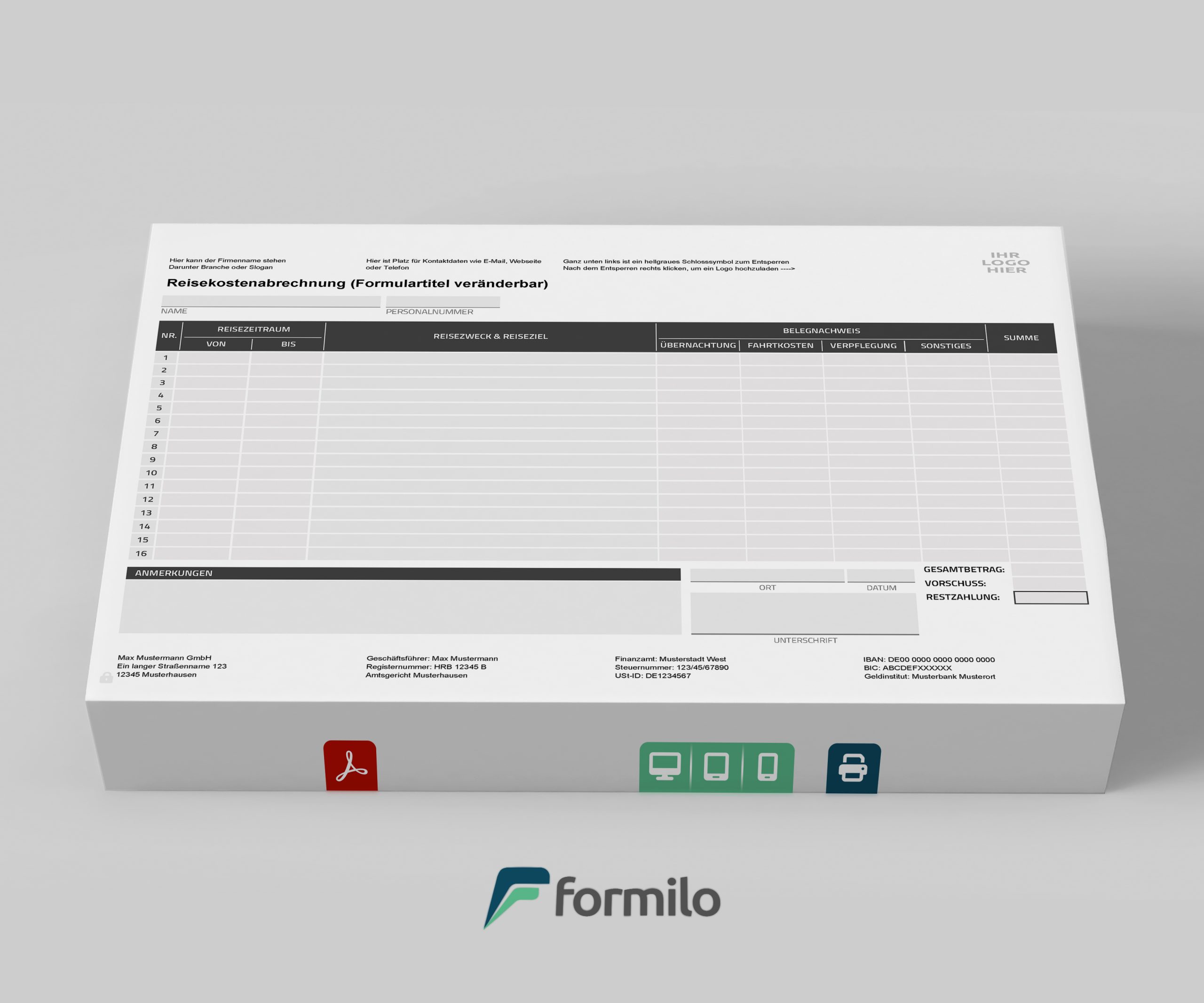 Die PDF-Vorlage ist vollständig personalisierbar und lässt sich mit gängigen, kostenlosen PDF-Viewern wie Adobe Reader bearbeiten. Sämtliche Kopfdaten, Fußzeilen und die Bezeichnung des Formulars können individuell angepasst werden. Auch das eigene Unternehmenslogo kann mit wenigen Klicks eingefügt werden. So entsteht ein professioneller Eindruck nach außen, ohne den Aufwand einer eigenen Formularentwicklung.