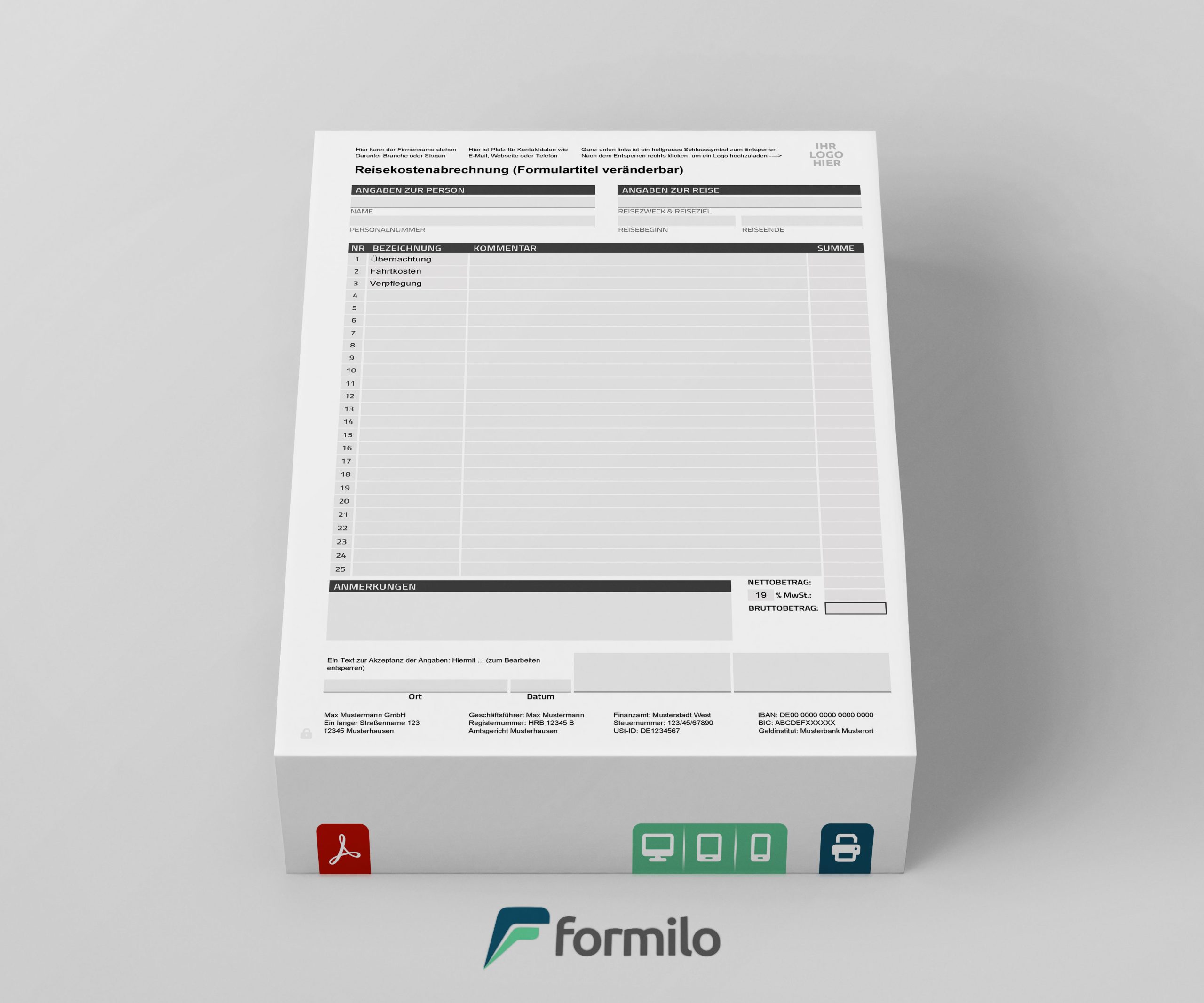 Diese Reisekostenabrechnungsvorlage von Formilo bietet Unternehmen eine effiziente Möglichkeit, geschäftliche Reisekosten strukturiert und steuerlich korrekt zu dokumentieren. Die Vorlage enthält spezielle Felder zur getrennten Ausweisung von Netto- und Mehrwertsteuerbeträgen. Das ist insbesondere für Unternehmen relevant, die zum Vorsteuerabzug berechtigt sind und ihre Eingangsbelege systematisch auswerten.