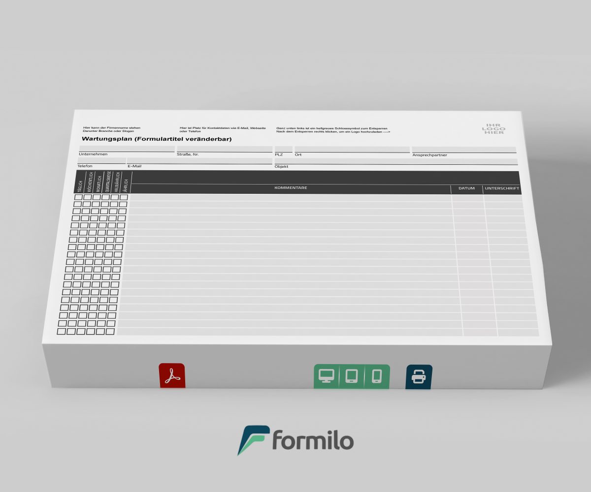 Die Vorlage lässt sich direkt nach dem Download mit einem kostenlosen PDF-Viewer wie Adobe Reader bearbeiten. Unternehmen können sämtliche Kopfdaten wie Firmennamen, Anschrift, Ansprechpartner oder Kontaktdaten eintragen und bei Bedarf ändern. Auch die Formularbezeichnung kann individuell angepasst werden. Ein weiteres Highlight ist die einfache Logo-Integration: Mit wenigen Klicks wird das eigene Firmenlogo eingefügt, um den Wartungsplan unternehmenseinheitlich zu gestalten. Dank des Schlosssymbols kann der Bearbeitungsmodus gezielt eingeschränkt werden, um versehentliche Änderungen am Layout während der Nutzung auszuschließen.