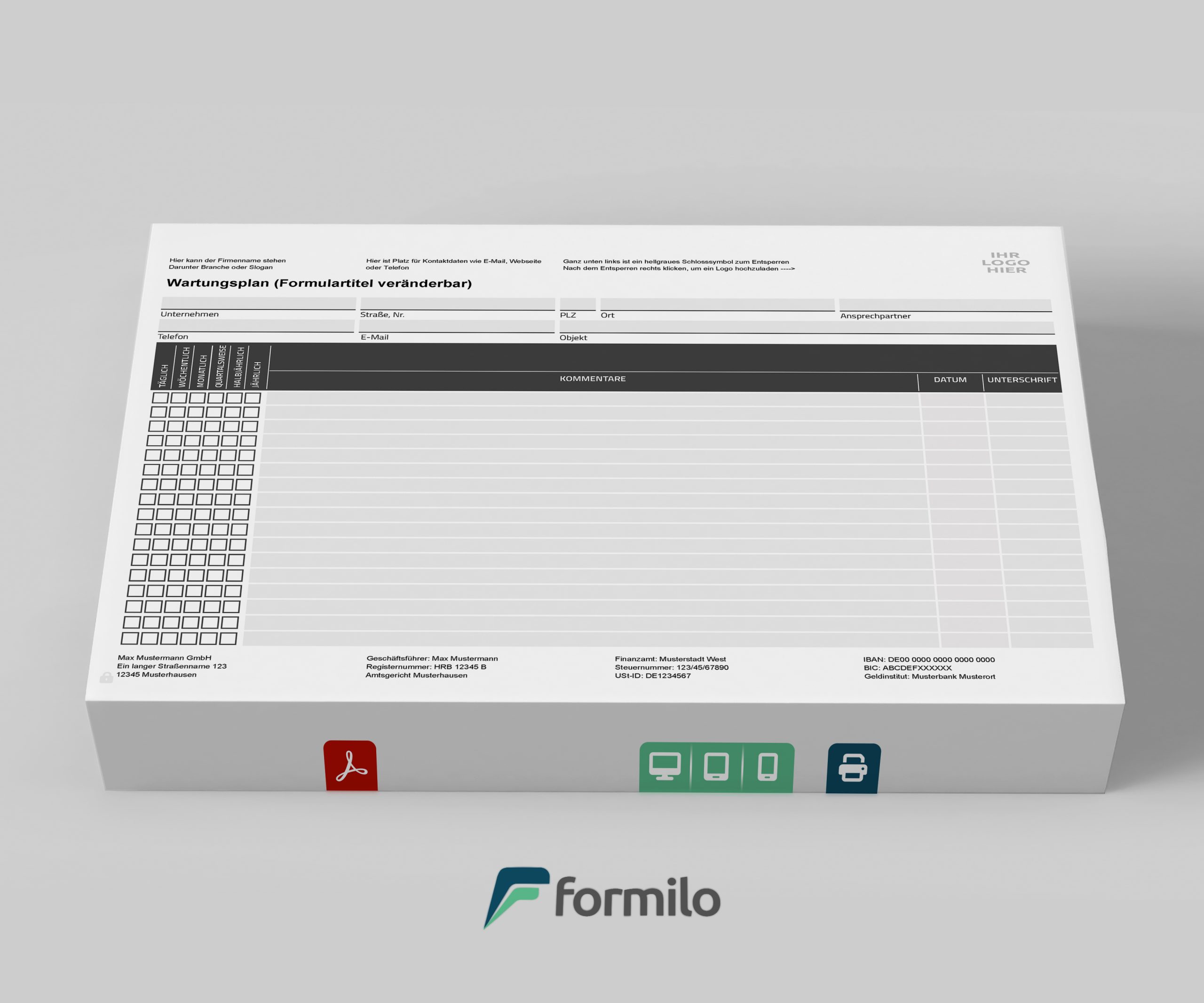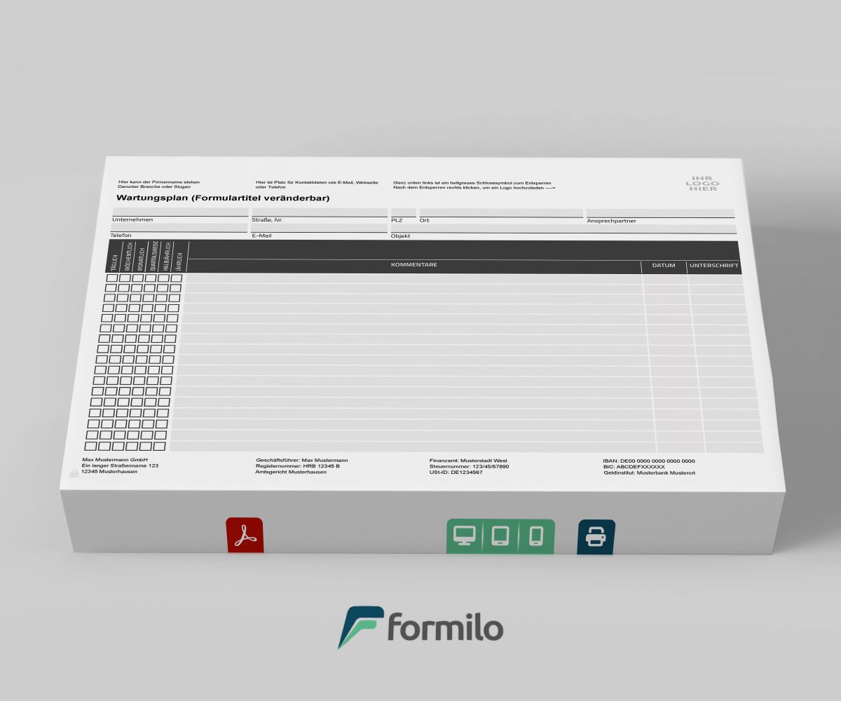 Im oberen Bereich der Vorlage befindet sich ein detailreiches Adressfeld, das alle wichtigen Unternehmensangaben strukturiert abbildet – ein essenzieller Bestandteil bei der internen Zuordnung sowie bei Dokumentationen gegenüber Behörden oder Versicherungen. Die eigentliche Tabelle zur Wartungserfassung ist klar gegliedert: Neben den Periodenfeldern finden sich auch Unterschriftszeilen für jede Wartungseinheit. Der Abschlussbereich enthält ein mehrzeiliges, freies Textfeld sowie Felder für Ort, Datum und eine abschließende Unterschrift. Diese Kombination ermöglicht es, sowohl rechtliche Anforderungen als auch individuelle Unternehmensstandards flexibel umzusetzen.