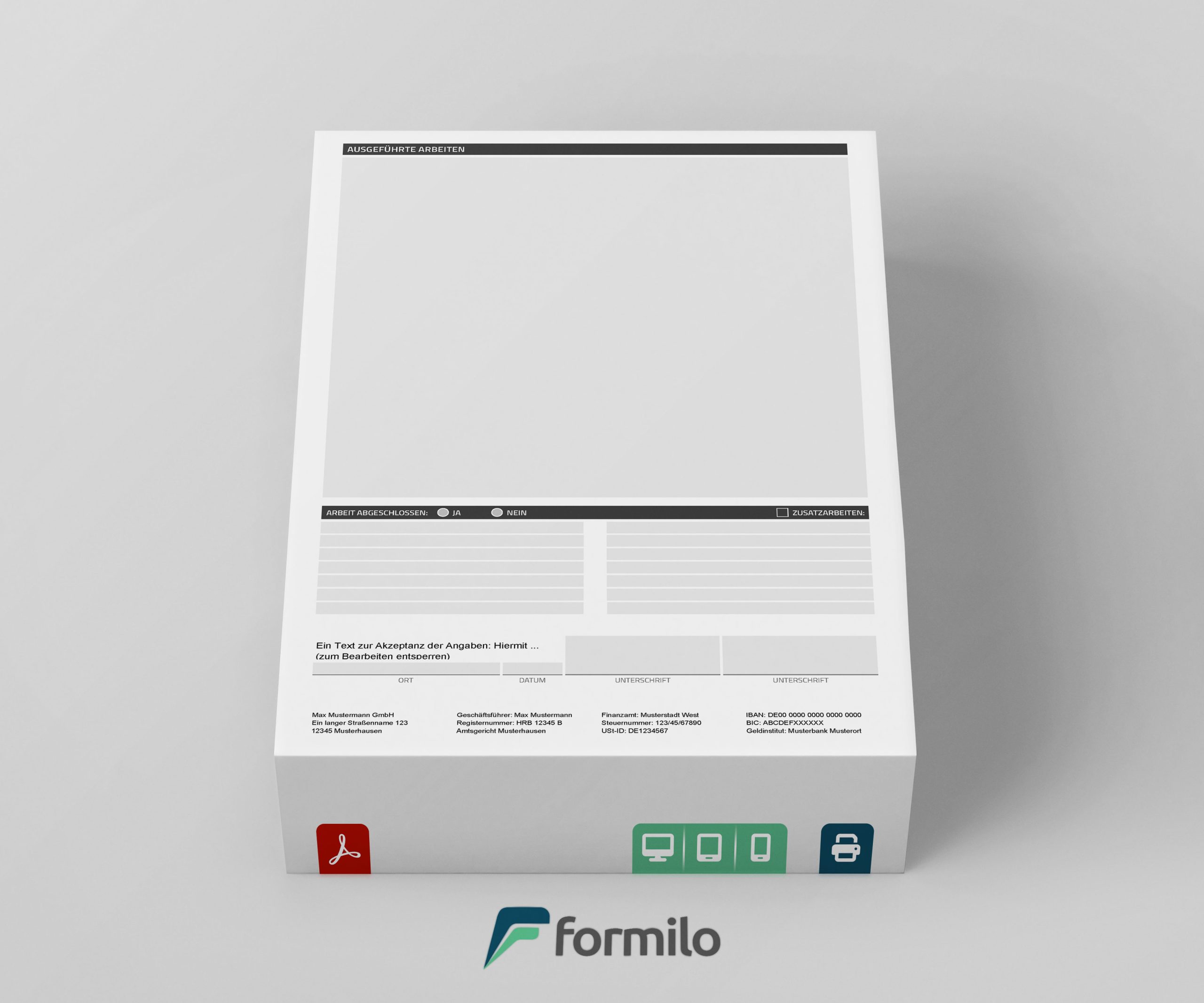Die Vorlage kann direkt im Webshop von Formilo erworben und unmittelbar heruntergeladen werden. Sie ist so gestaltet, dass Anwender sie mit einem kostenlosen PDF-Viewer wie Adobe Reader individuell anpassen können. Kopf- und Fußzeilen, die Formularbezeichnung sowie das Unternehmenslogo lassen sich mit wenigen Klicks einfügen oder ändern. Damit entsteht ein professionelles, auf die jeweilige Firma zugeschnittenes Protokoll, ohne dass dafür spezielle Software oder technische Kenntnisse erforderlich sind. Durch ein eingebautes Schlosssymbol lassen sich personalisierte Bereiche sperren, sodass bei der täglichen Arbeit ausschließlich die vorgesehenen Felder bearbeitet werden können.