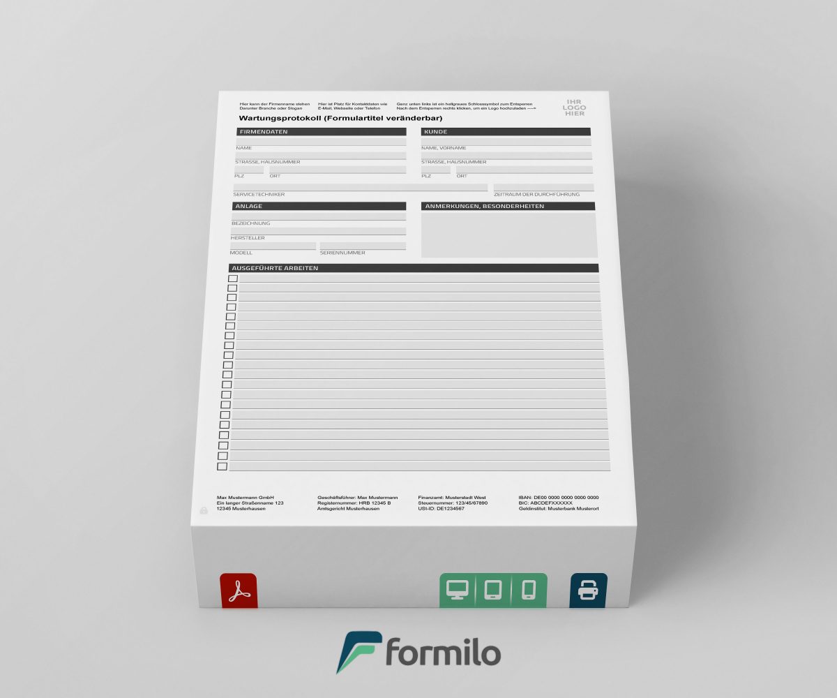 Die zweiseitige Wartungsprotokoll Vorlage von Formilo ist eine praxisorientierte Lösung für Unternehmen, die ihre Wartungsarbeiten zuverlässig und strukturiert dokumentieren möchten. Nach dem Kauf im Webshop steht das Formular sofort zum Download bereit und lässt sich mit jedem kostenlosen PDF Viewer wie Adobe Reader bearbeiten. Eine Programmierung ist nicht notwendig: Kopf- und Fußdaten, die Formularbezeichnung und das Firmenlogo können in wenigen Schritten angepasst werden. Durch die integrierte Schloss-Funktion lassen sich bestimmte Felder sperren, sodass nur die vorgesehenen Bereiche für die tägliche Nutzung freigegeben sind. So bleiben Unternehmensangaben und Designbestandteile geschützt.