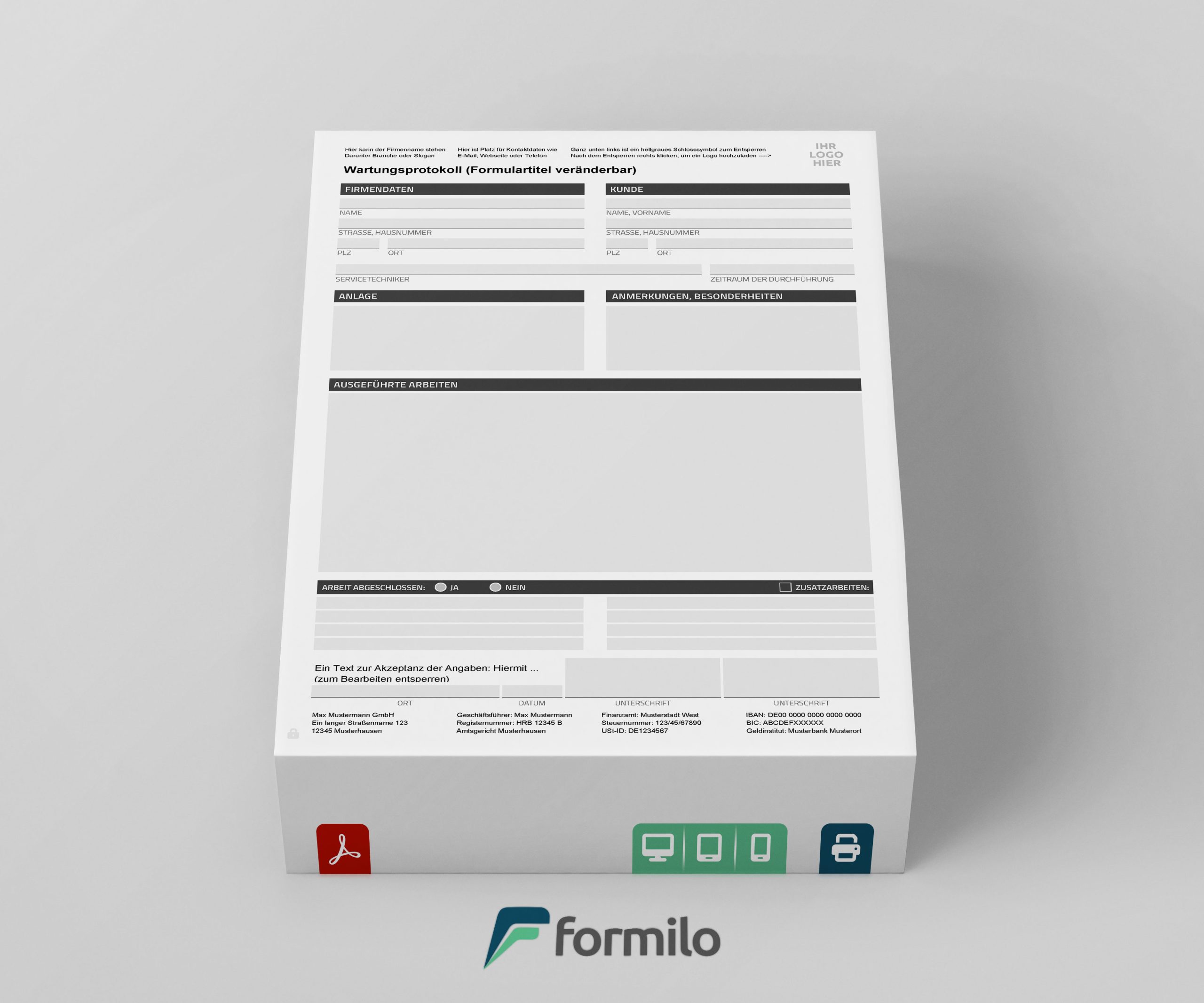 Die einseitige Wartungsprotokoll Vorlage von Formilo bietet Unternehmen eine klare Struktur, um Wartungsarbeiten schnell und nachvollziehbar zu erfassen. Nach dem Kauf im Webshop steht sie sofort als interaktive PDF-Datei zum Download bereit. Sie ist mit jedem kostenlosen PDF Viewer wie Adobe Reader nutzbar und erfordert keinerlei Programmierkenntnisse. Kopf- und Fußzeilen können individuell angepasst, die Formularbezeichnung geändert und ein Firmenlogo mit wenigen Klicks eingefügt werden. Dank der integrierten Schloss-Funktion lassen sich feste Inhalte sperren, sodass nur die vorgesehenen Felder bearbeitbar sind – ideal für die tägliche Praxis.