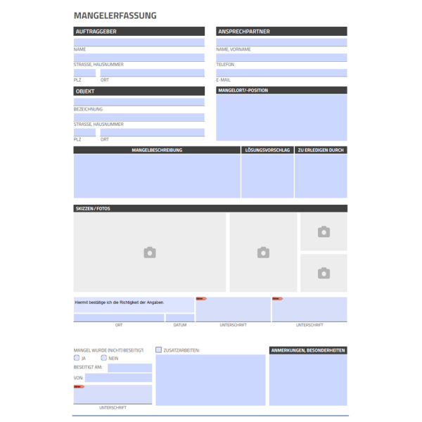 • Klare Beschreibung: Detaillierte Erfassung des Mangels mit präzisen Angaben.
