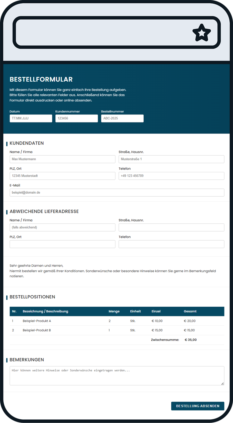 - PDF-Formulare: Geeignet für ausfüllbare und druckbare Bestellformulare.