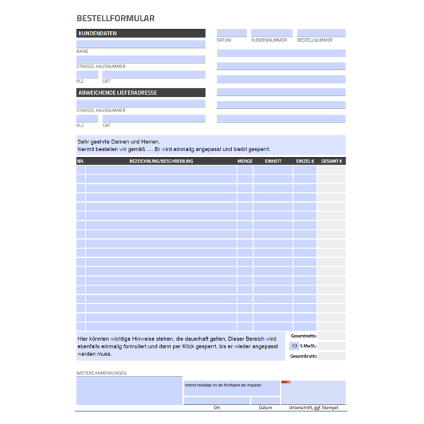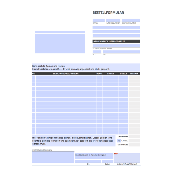 Ein vollständiges Bestellformular trägt dazu bei, den gesamten Bestellprozess effizient zu gestalten. Digitale Formulare bieten zudem Validierungsmechanismen, die sicherstellen, dass alle Pflichtfelder ausgefüllt sind und die Daten korrekt erfasst werden. Durch klare Strukturierung und intuitive Benutzerführung wird die Fehlerquote minimiert und die Kundenzufriedenheit gesteigert.