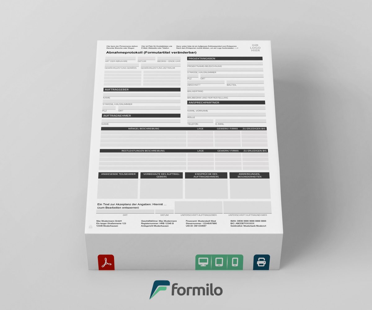Die Abnahmeprotokoll-Vorlage kann direkt nach dem Kauf heruntergeladen und mit einem kostenlosen PDF Viewer wie Adobe Reader bearbeitet werden. Dabei lassen sich Kopfdaten, Fußzeilen und die Formularbezeichnung nach Bedarf anpassen. Die Vorlage unterstützt den Import eines eigenen Logos und ermöglicht dadurch ein einheitliches Unternehmensbild – ganz ohne zusätzliche Software oder technische Kenntnisse.