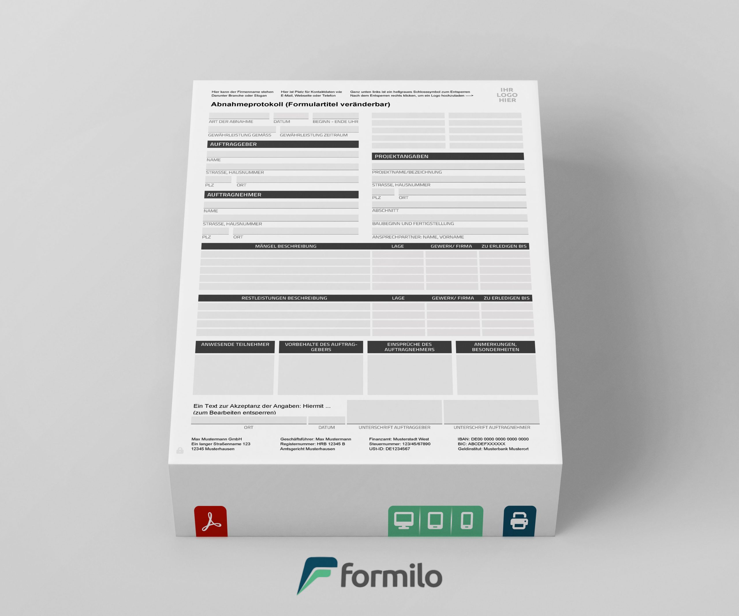 Abnahmeprotokoll-Vorlage mit Adressfeldern und Freitextoptionen